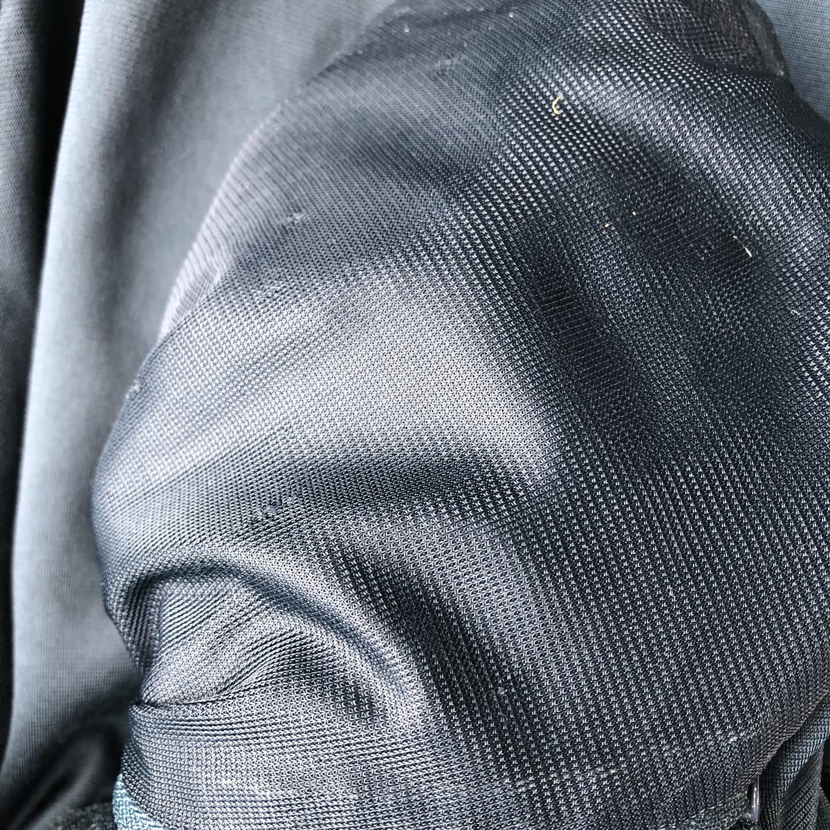 -Stain on front, right chest, right sleeve, right sleeve tip