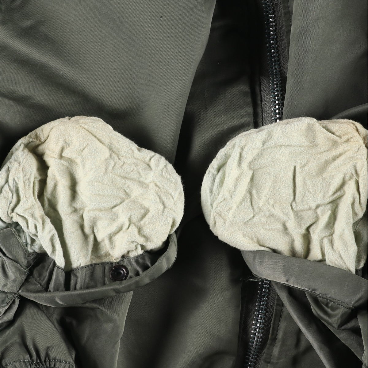 -Stain inside the front and left and right abdominal pockets. Rubbing on the right hem. Missing threads on the left and right abdominal sides. Missing threads under the left abdominal pocket flap.