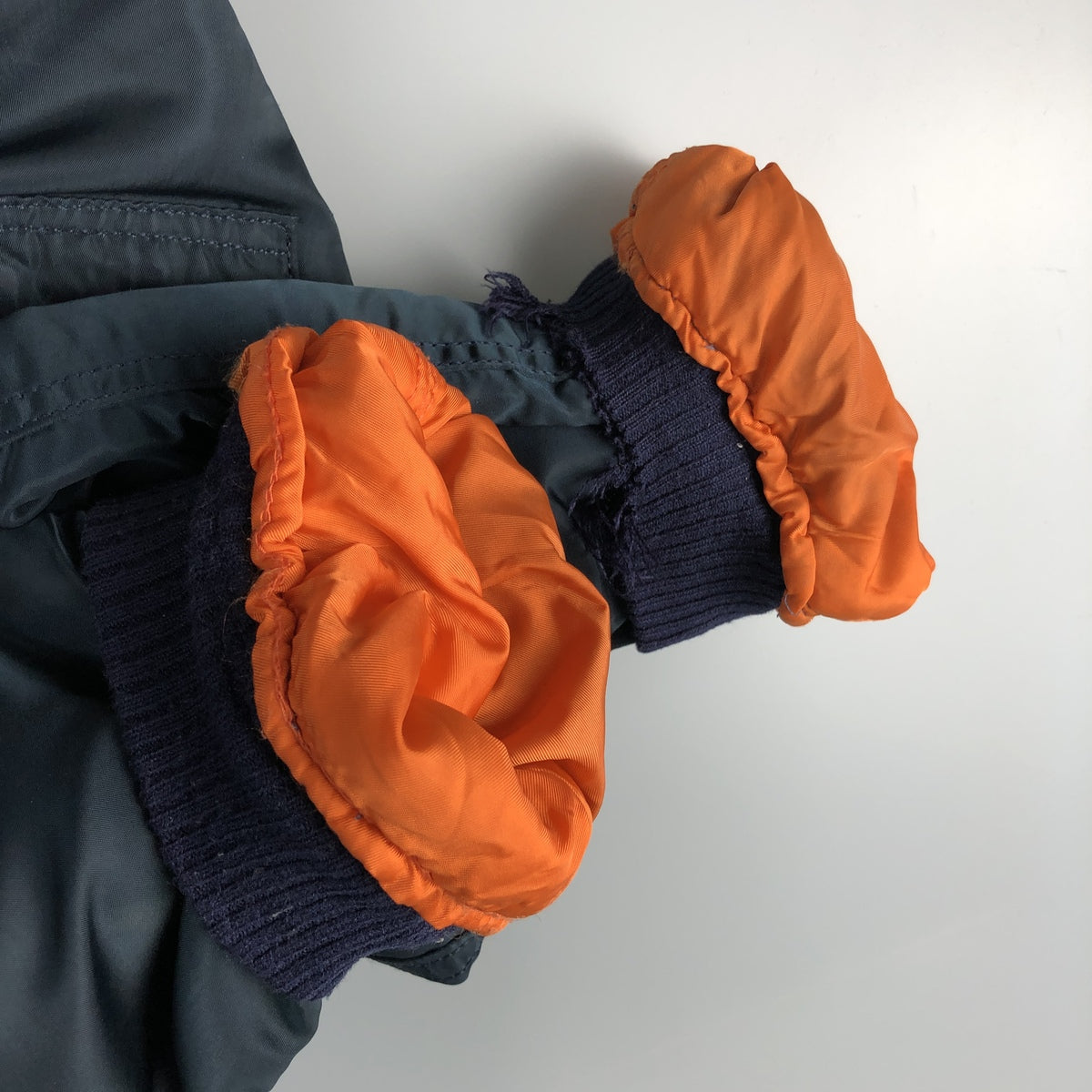 -Tear on the right sleeve tip