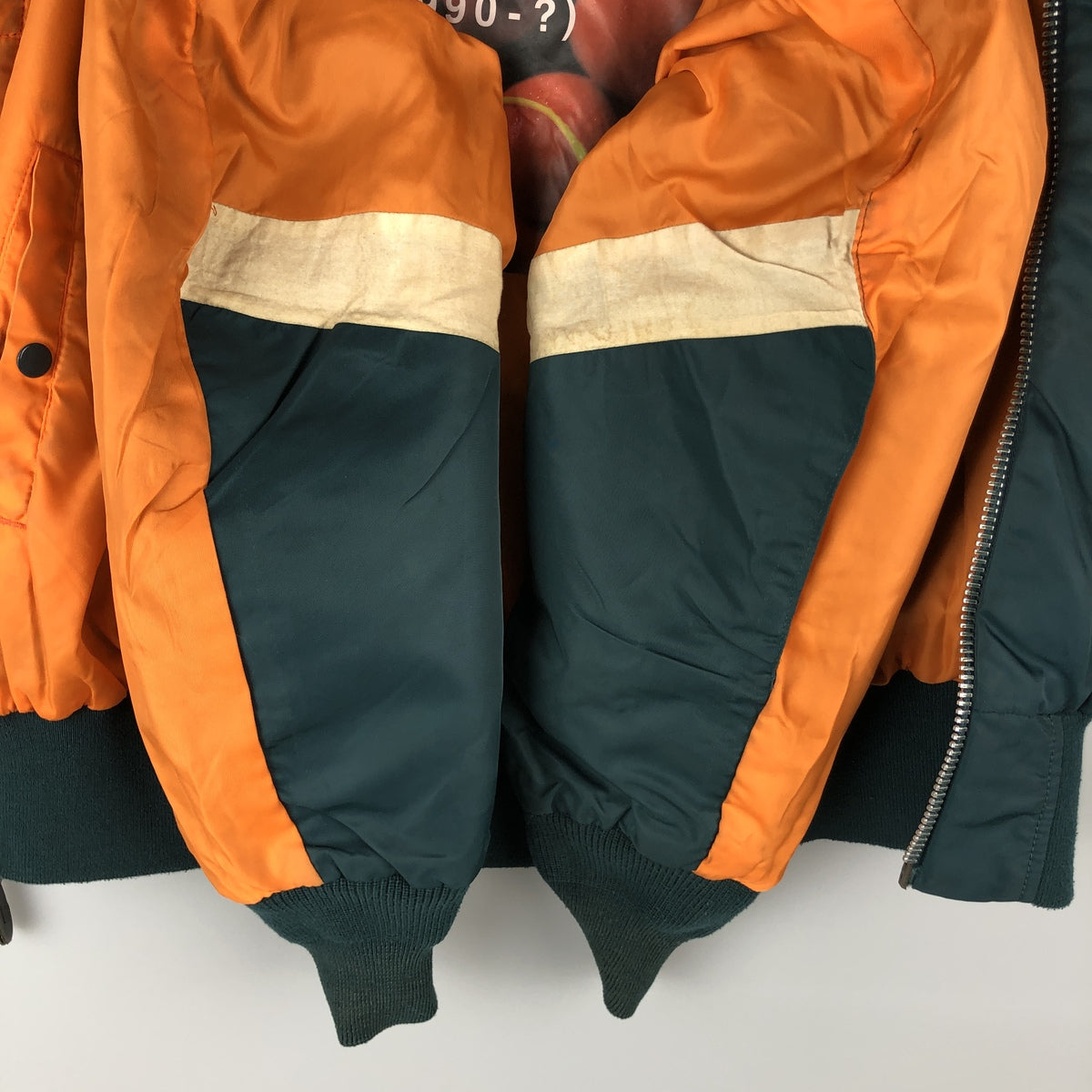 -Stain on the inside, neckline, shoulders, chest, underarms, abdomen, hems, sleeves, and sleeve tips