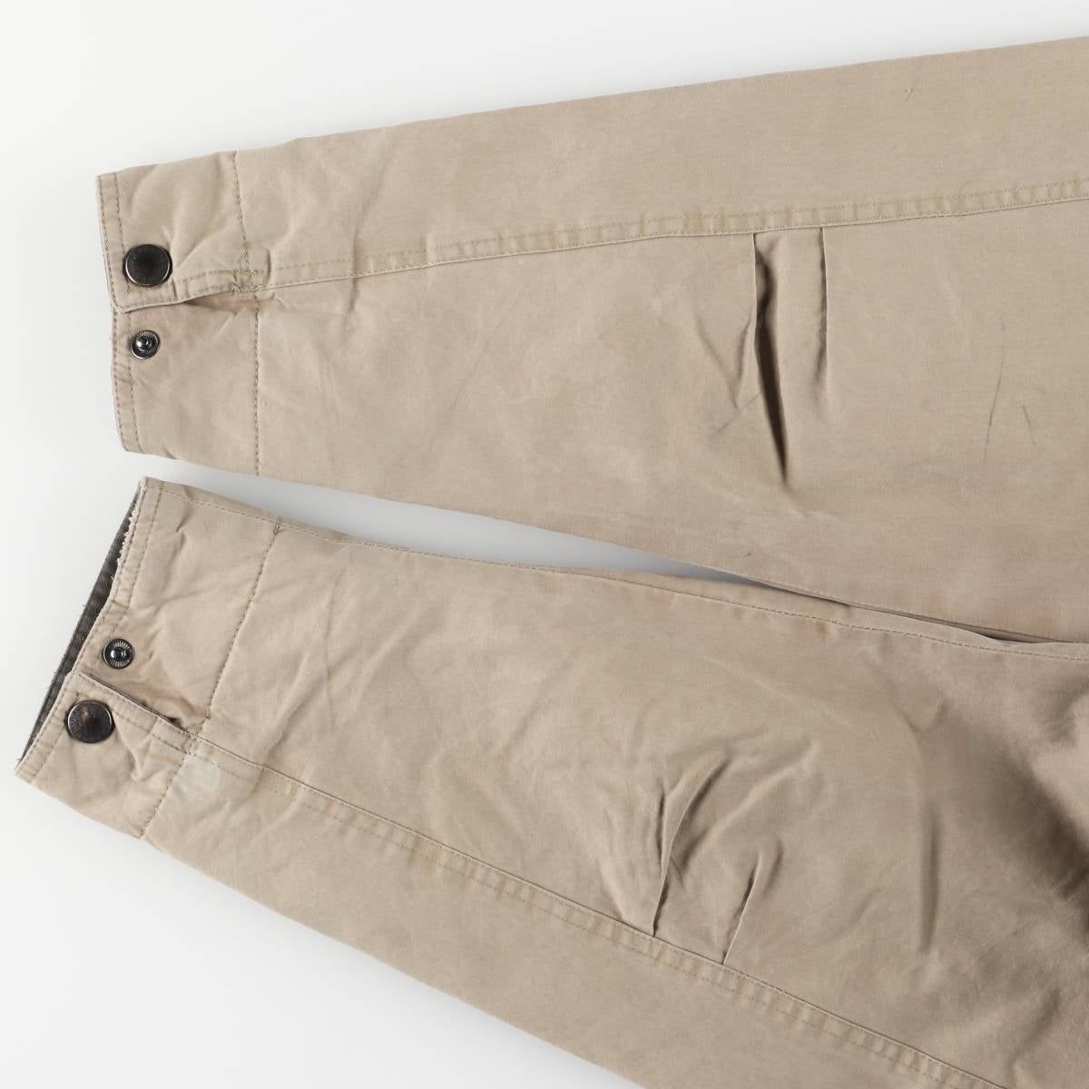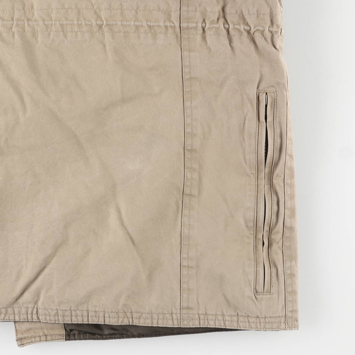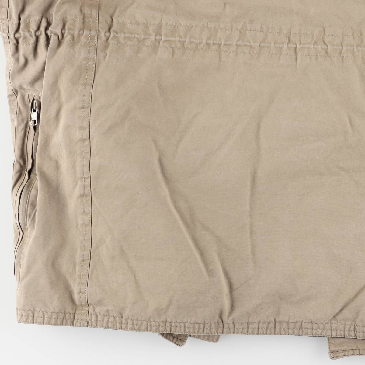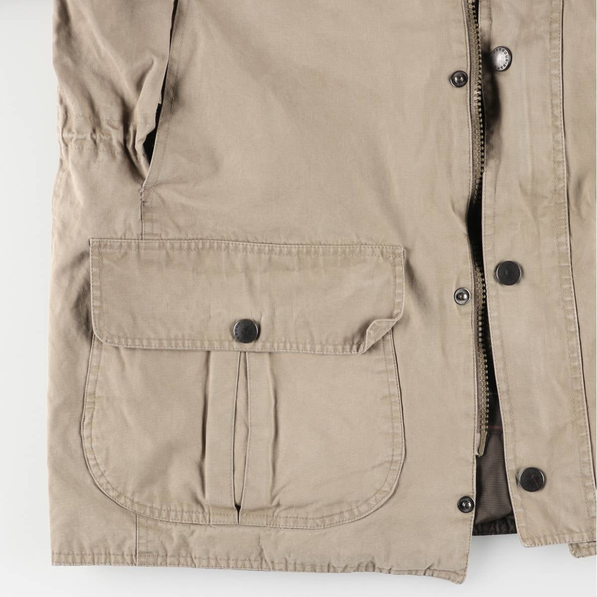 -Stain on the front, left shoulder, both arms, right chest, both cuffs, abdomen, and hem. There is a tear inside the left abdominal pocket. There is rubbing under the right hem pocket flap and on both cuffs. There is loose thread in the left hem pocket. There is a repair mark on the opening of the right abdominal pocket.