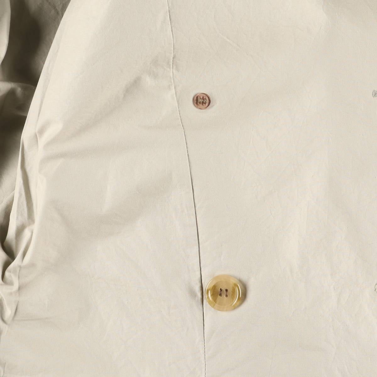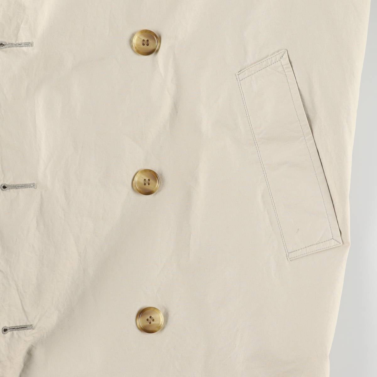 -Stain on the inside front, left chest, lower right and right hem. Second back button on the right chest is broken. Repair mark on back button on the left chest.