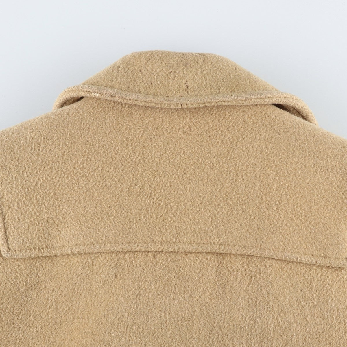 -Back, fabric peeling at neck, both arms, both sleeve ends and hem. Collar tear. Stain at both sleeve ends and hem.