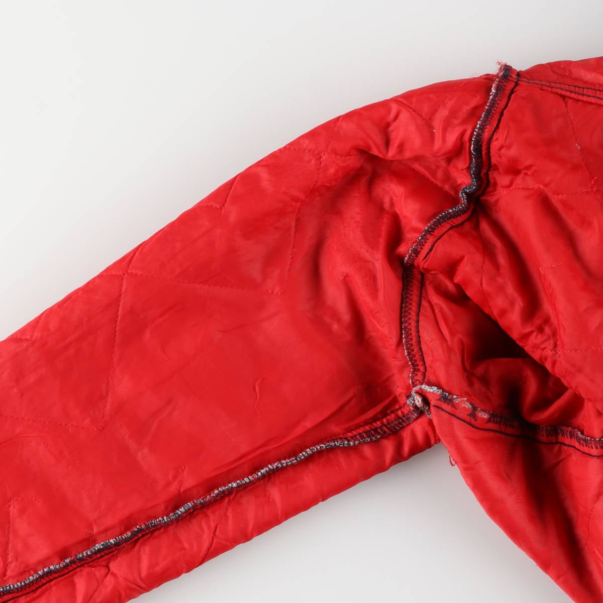 -Stain on back, collar, shoulders, both arms, both sleeve ends, back, hem. Missing threads on hem and right sleeve.