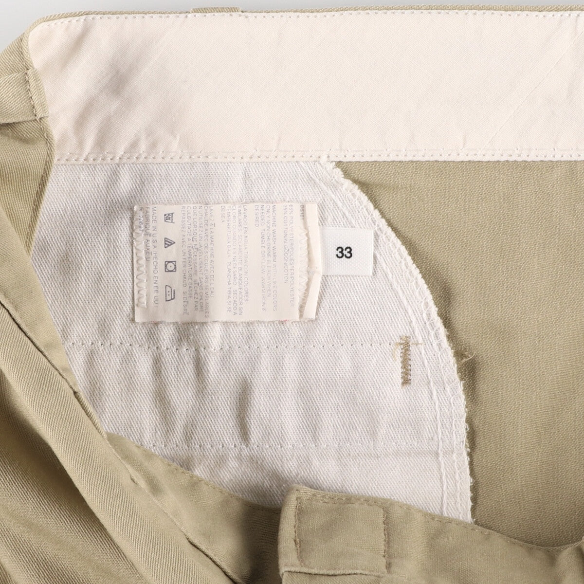 - Back: Stain around the middle of the waist, near the right pocket, right hem, left thigh to hem