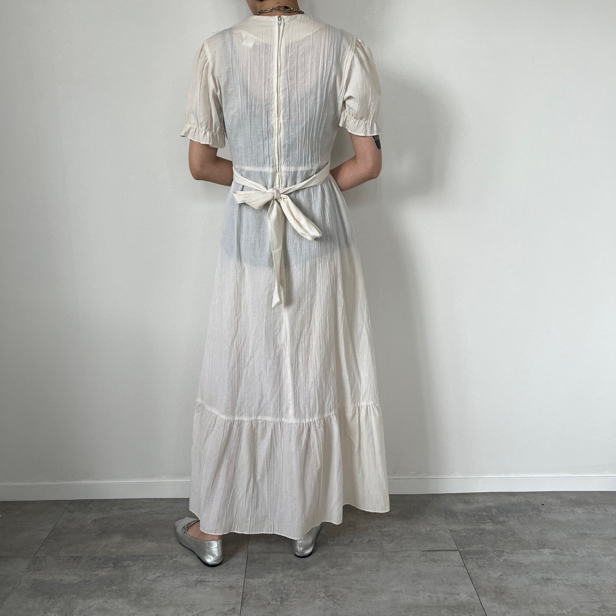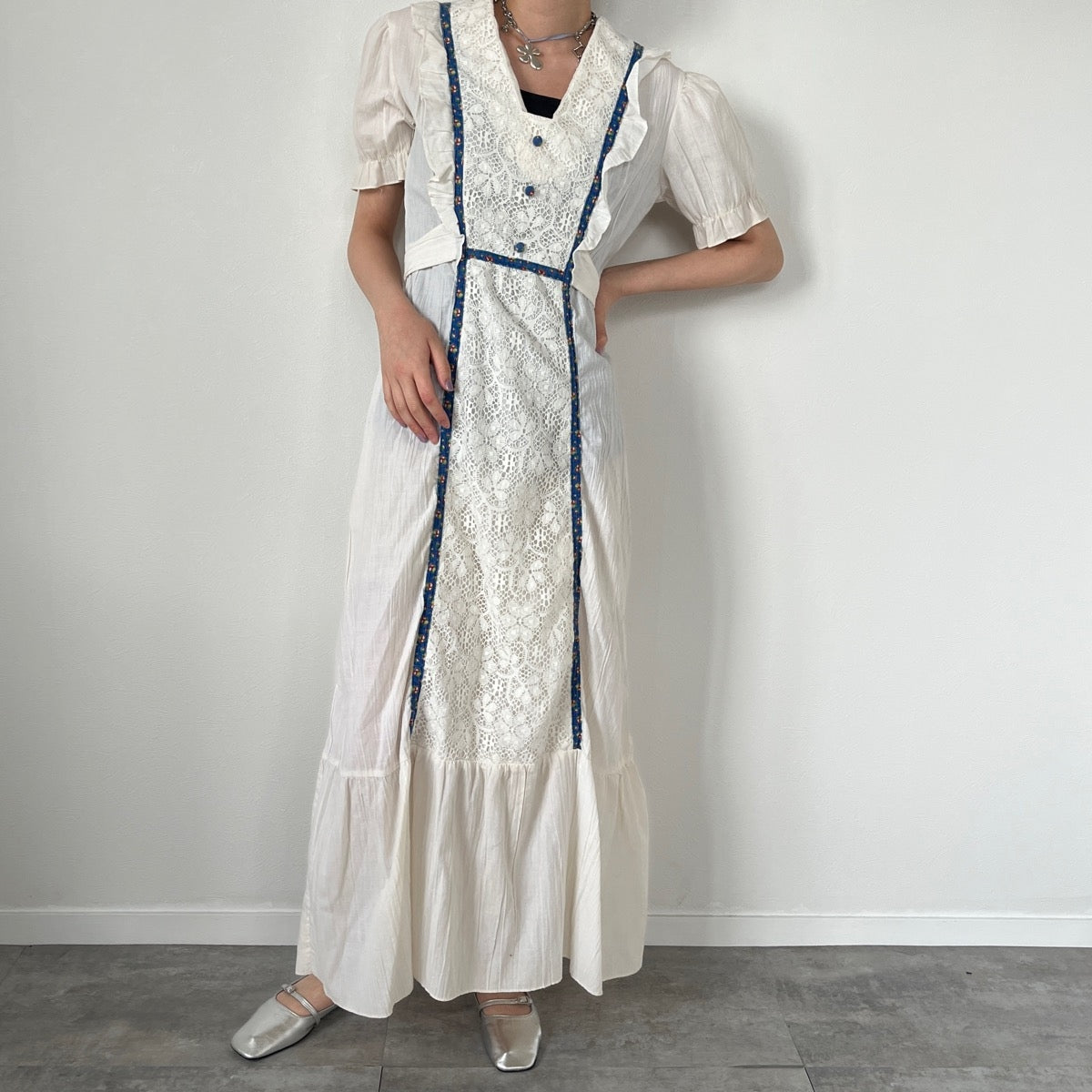 | Characteristics | Maxi length / vintage / race switching / With waist ribbon / Short sleeve |