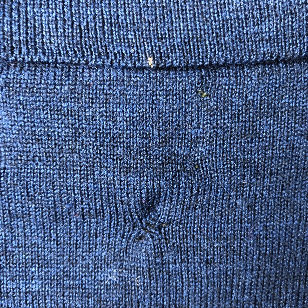 - Repair marks on the front and right sleeve. Stain on the left collar.