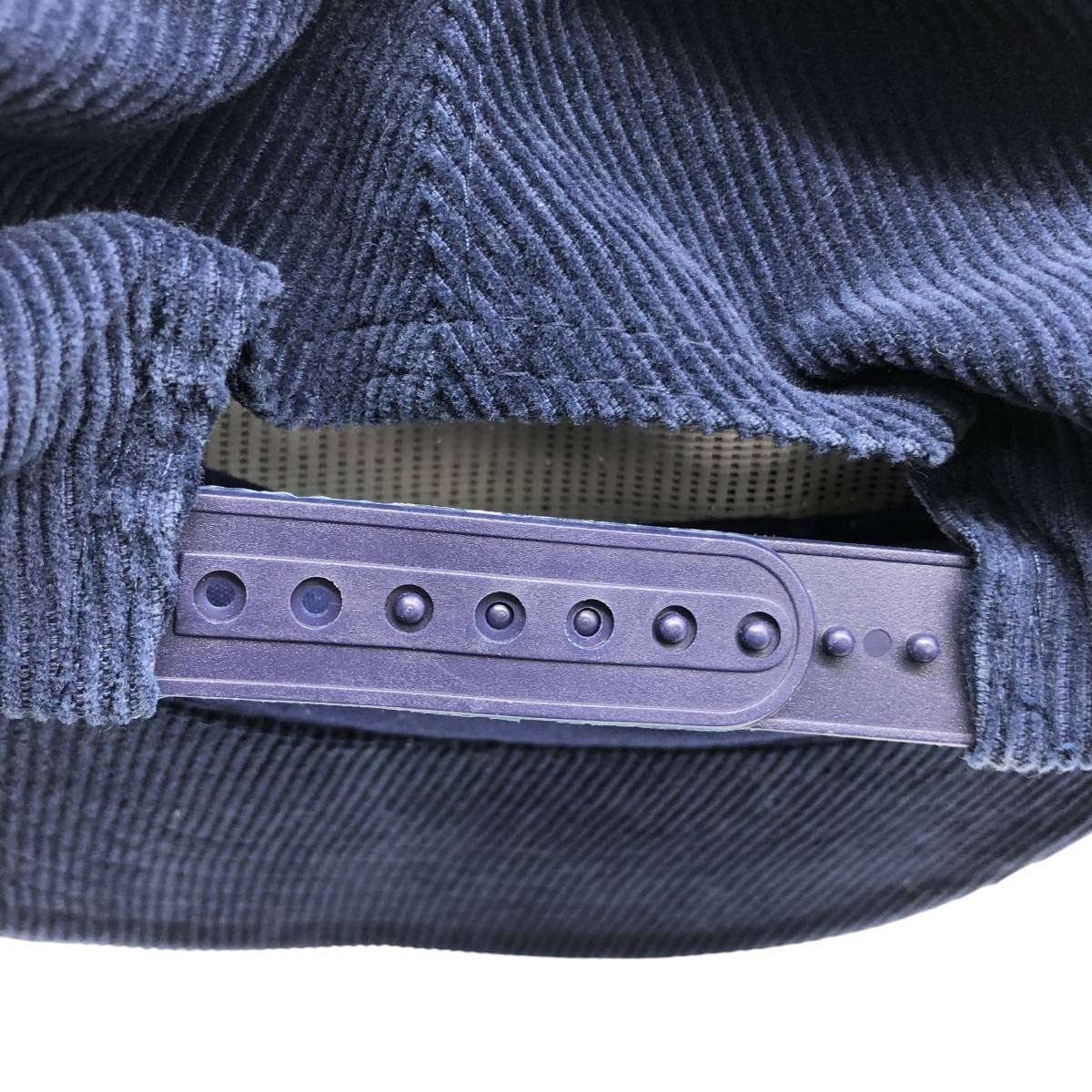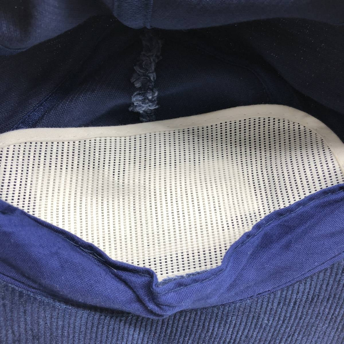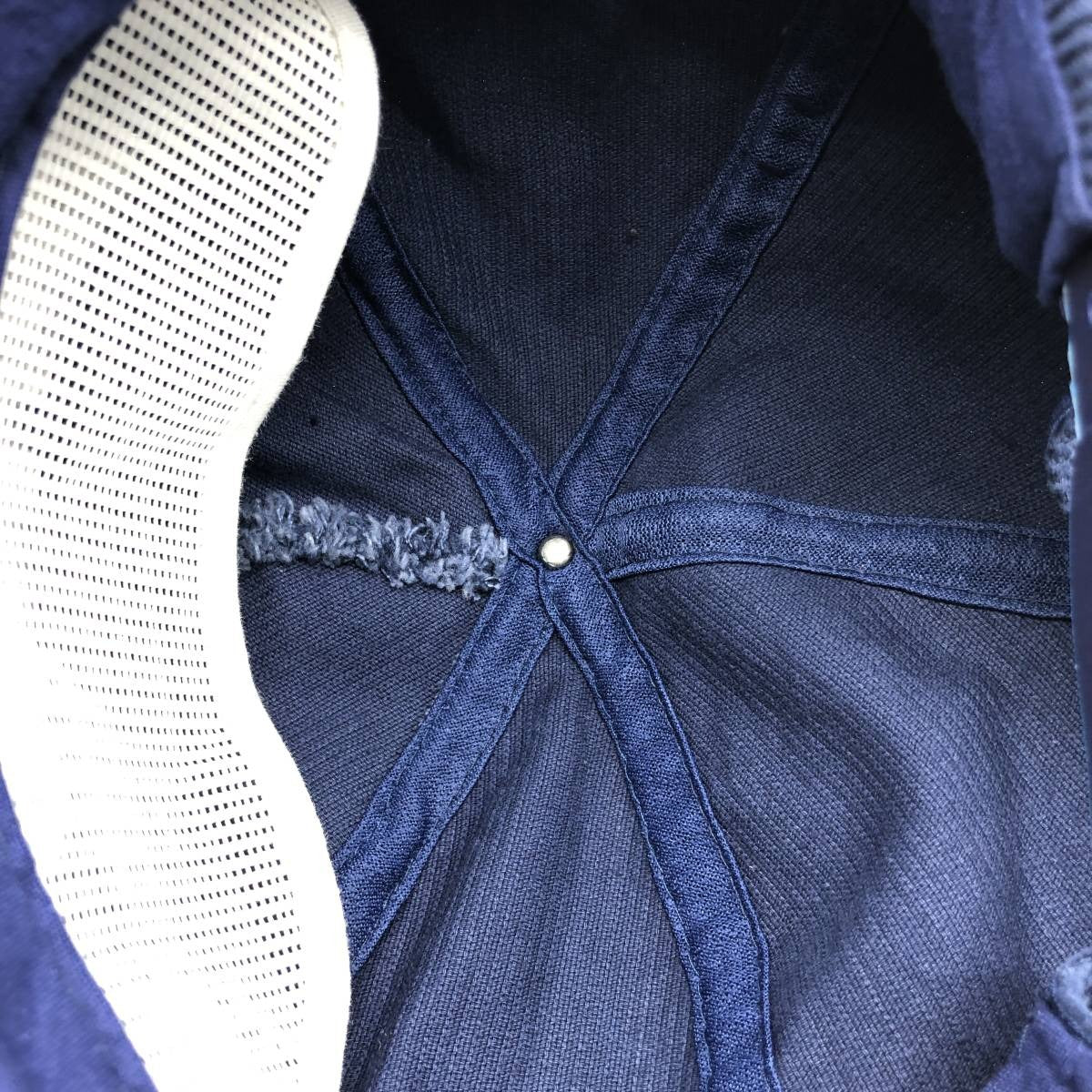 -Inner, mesh part has creases, tape part is faded, thread missing on left brim