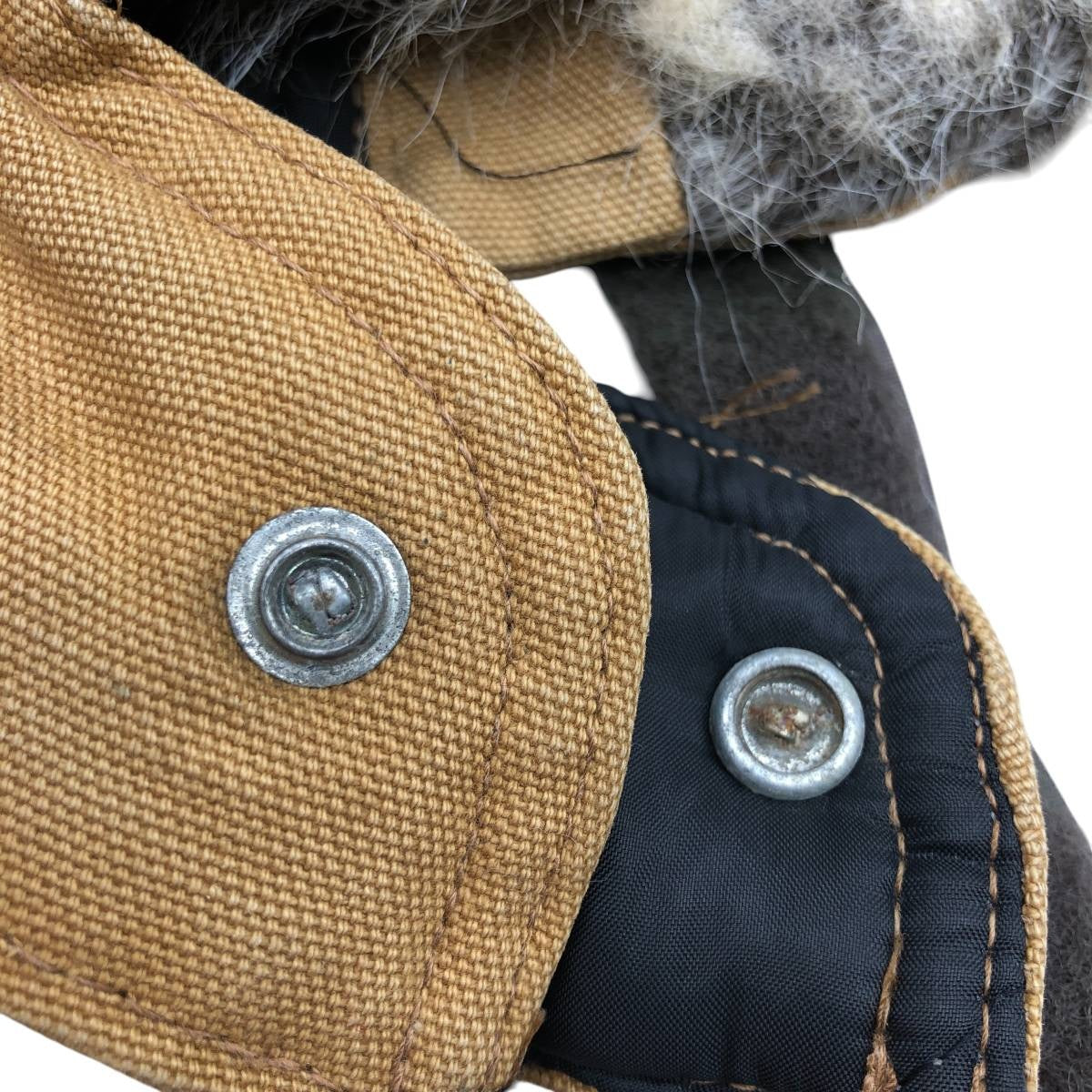 -Stain on front, top and chin strap. Rust on front and back of snap button on right side of neck.