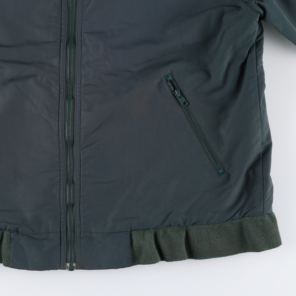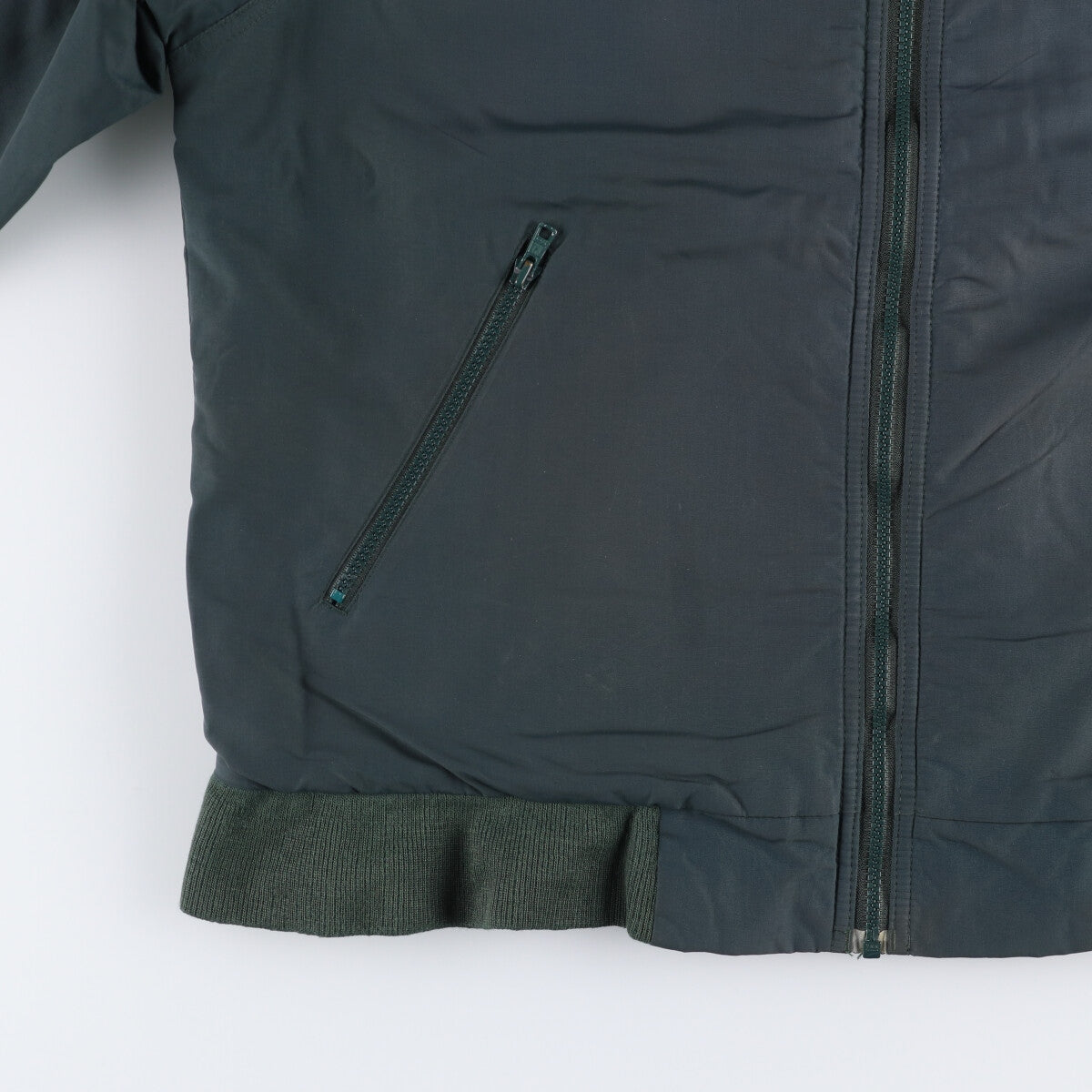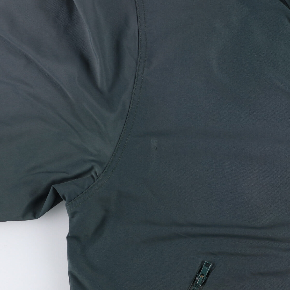 - Back, left armpit and right armhole are rubbed. Stain on both sleeve ends. Ribbed hem is stretched.