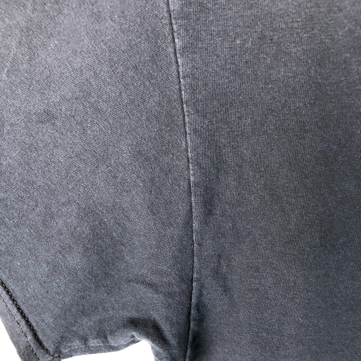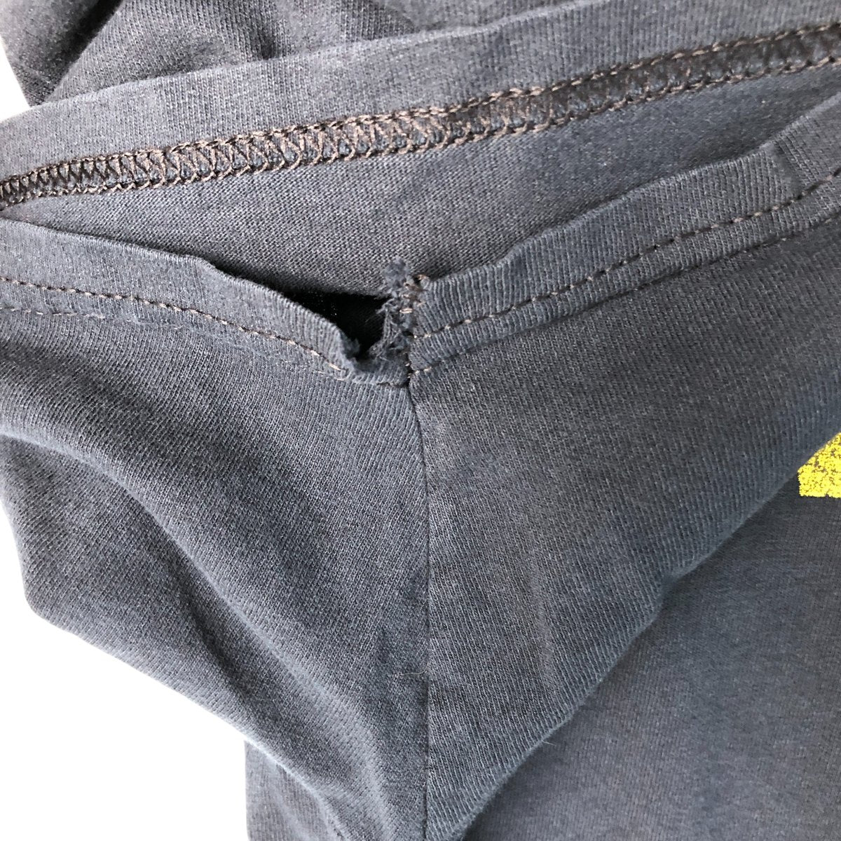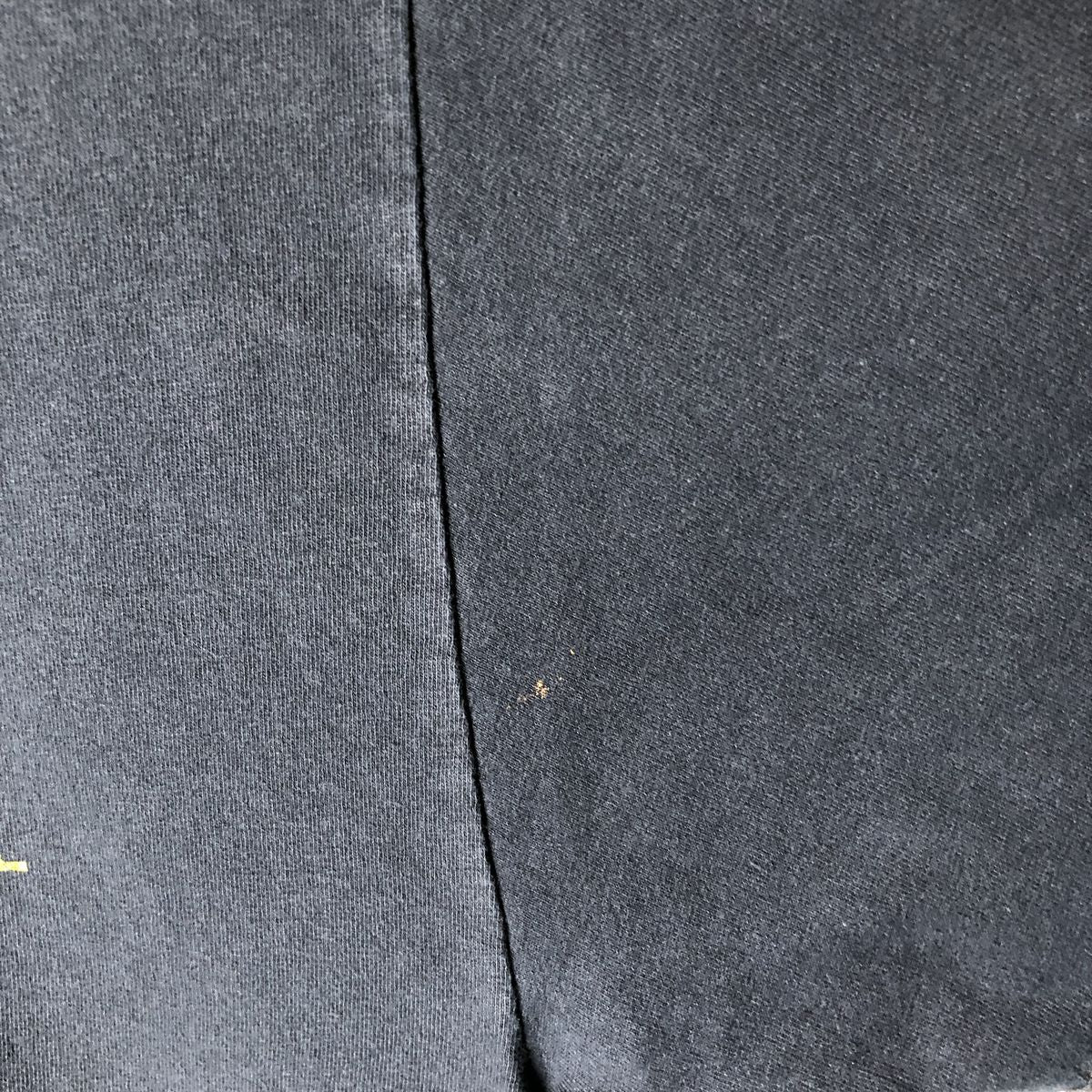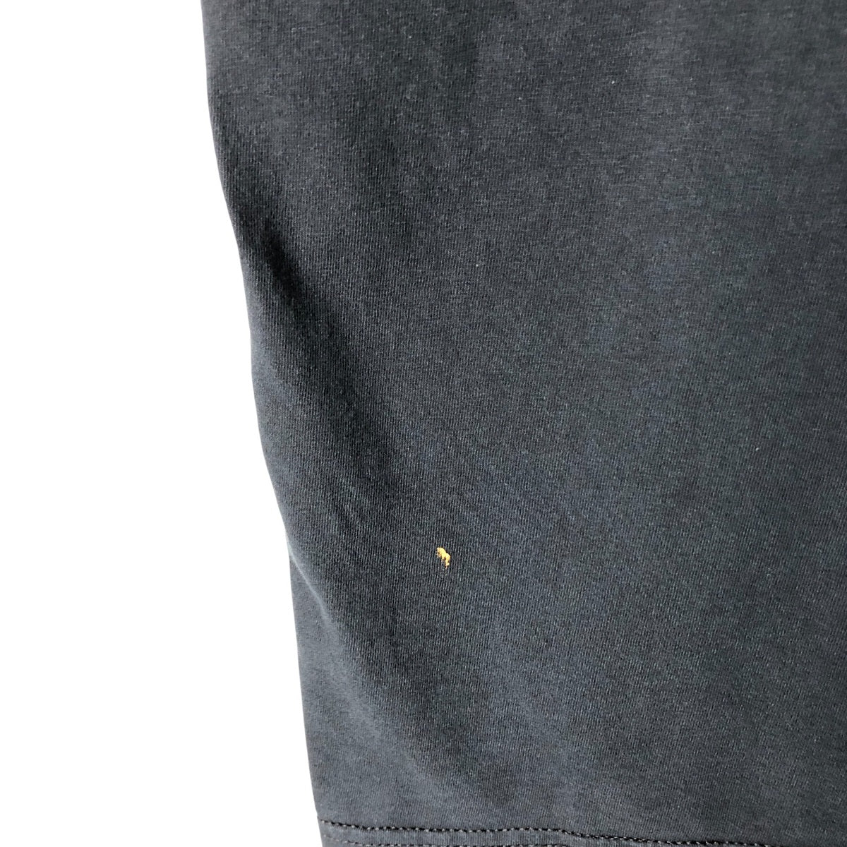 -Stain on front, chest, abdomen and left arm, hole on right arm, tear at side, loose thread at left sleeve end