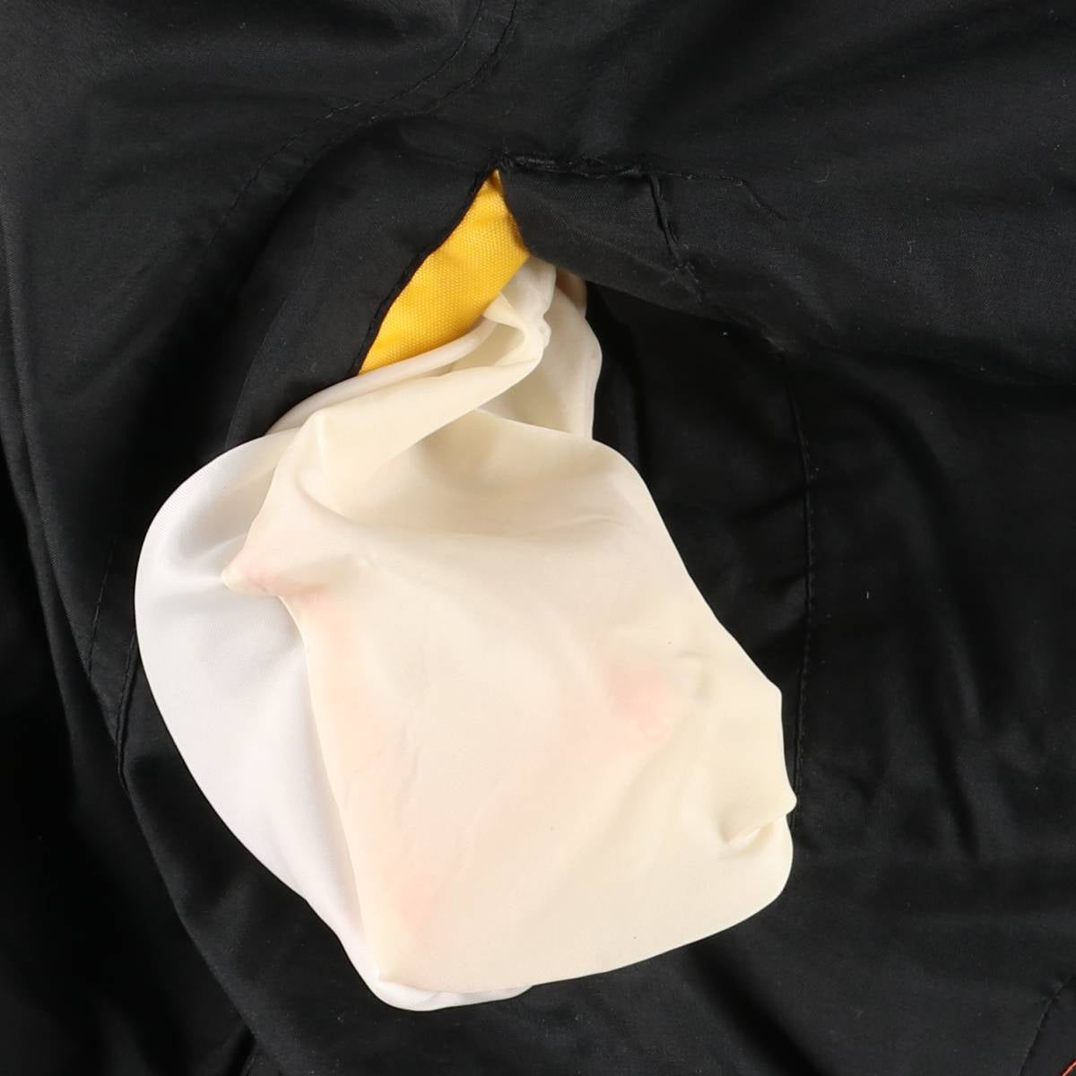 -Stain on the front right sleeve cuff, loose threads on the right shoulder, repair marks on the chest and both sides of the abdomen.