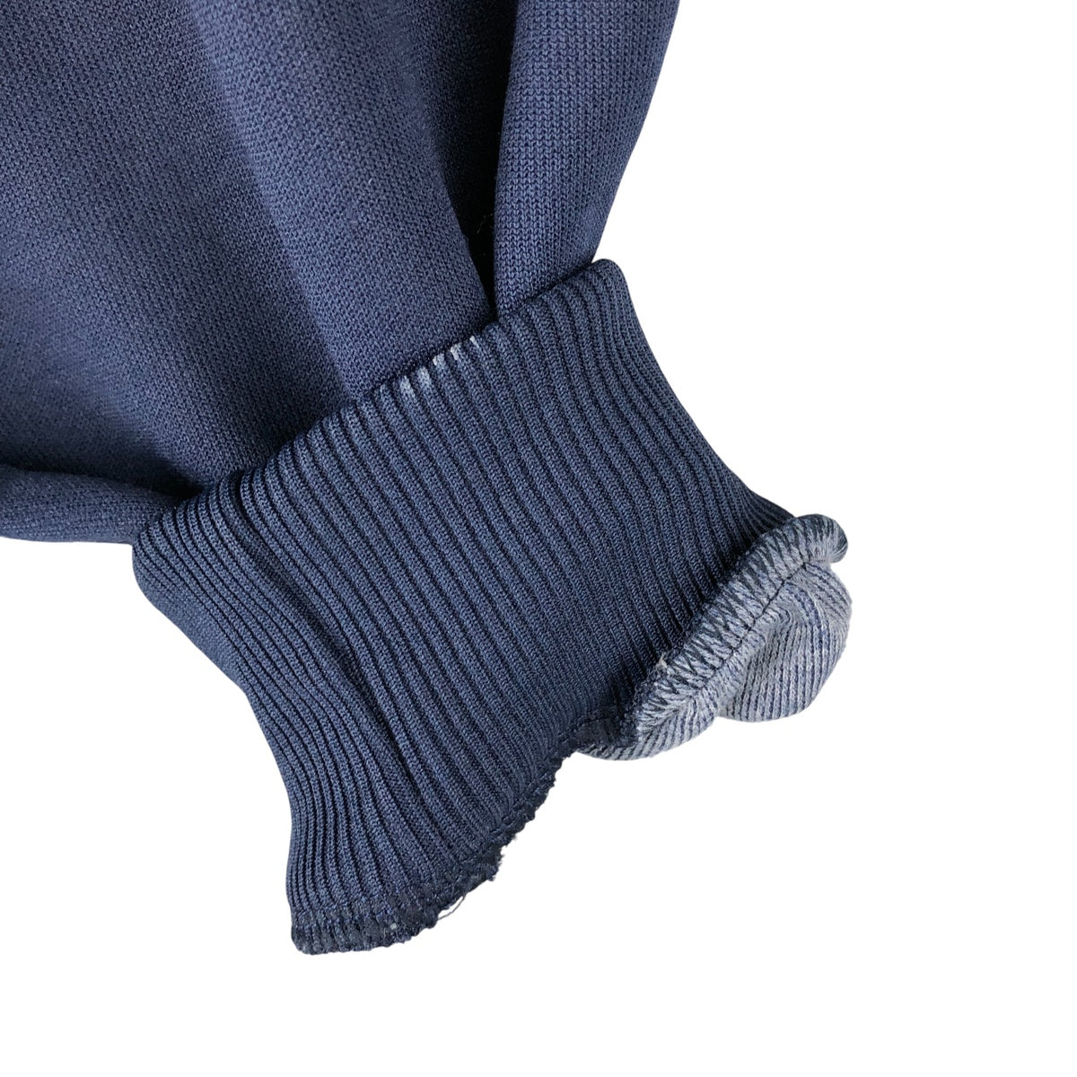 - Front zipper end tape peeling, collar tear, stain on right arm, left chest print peeling