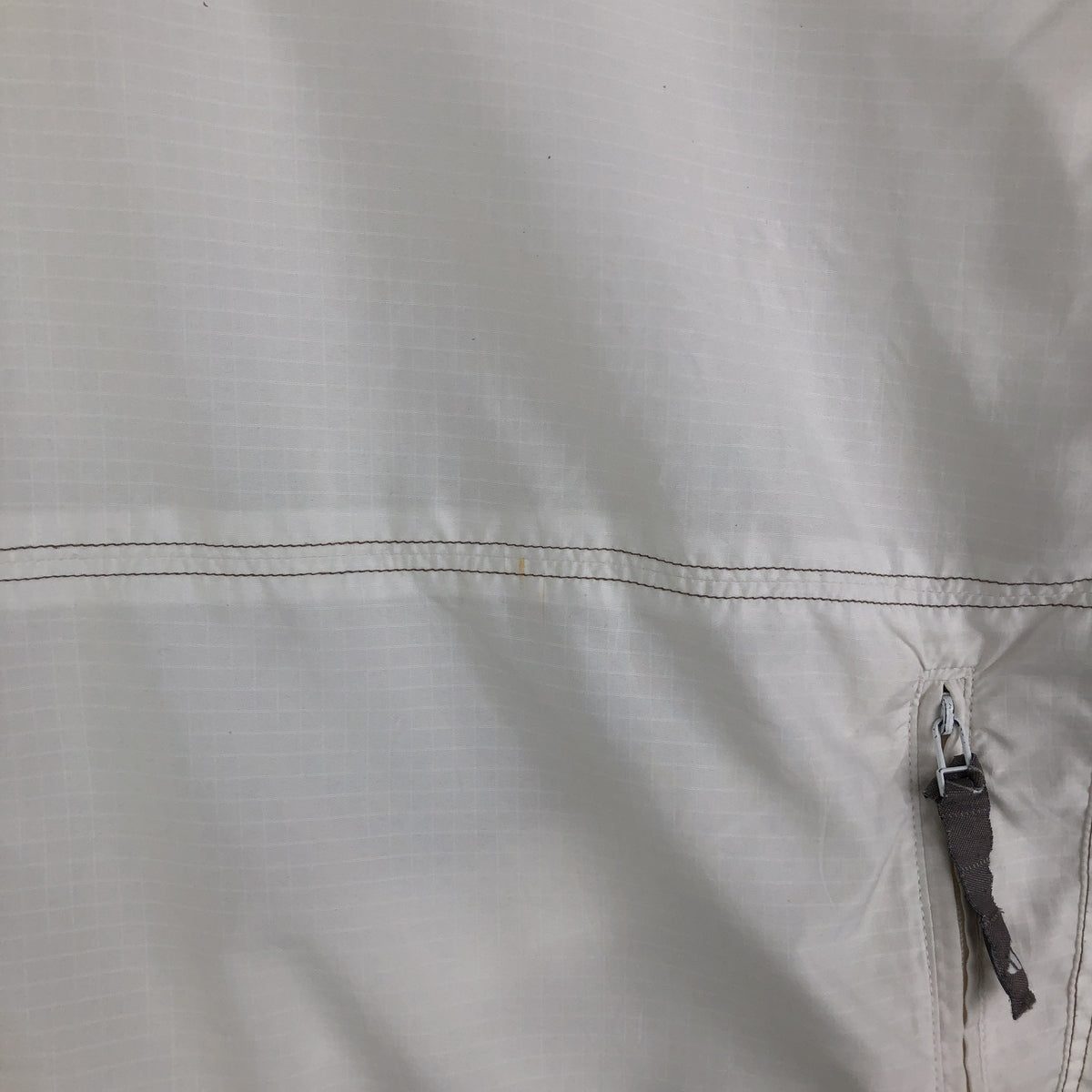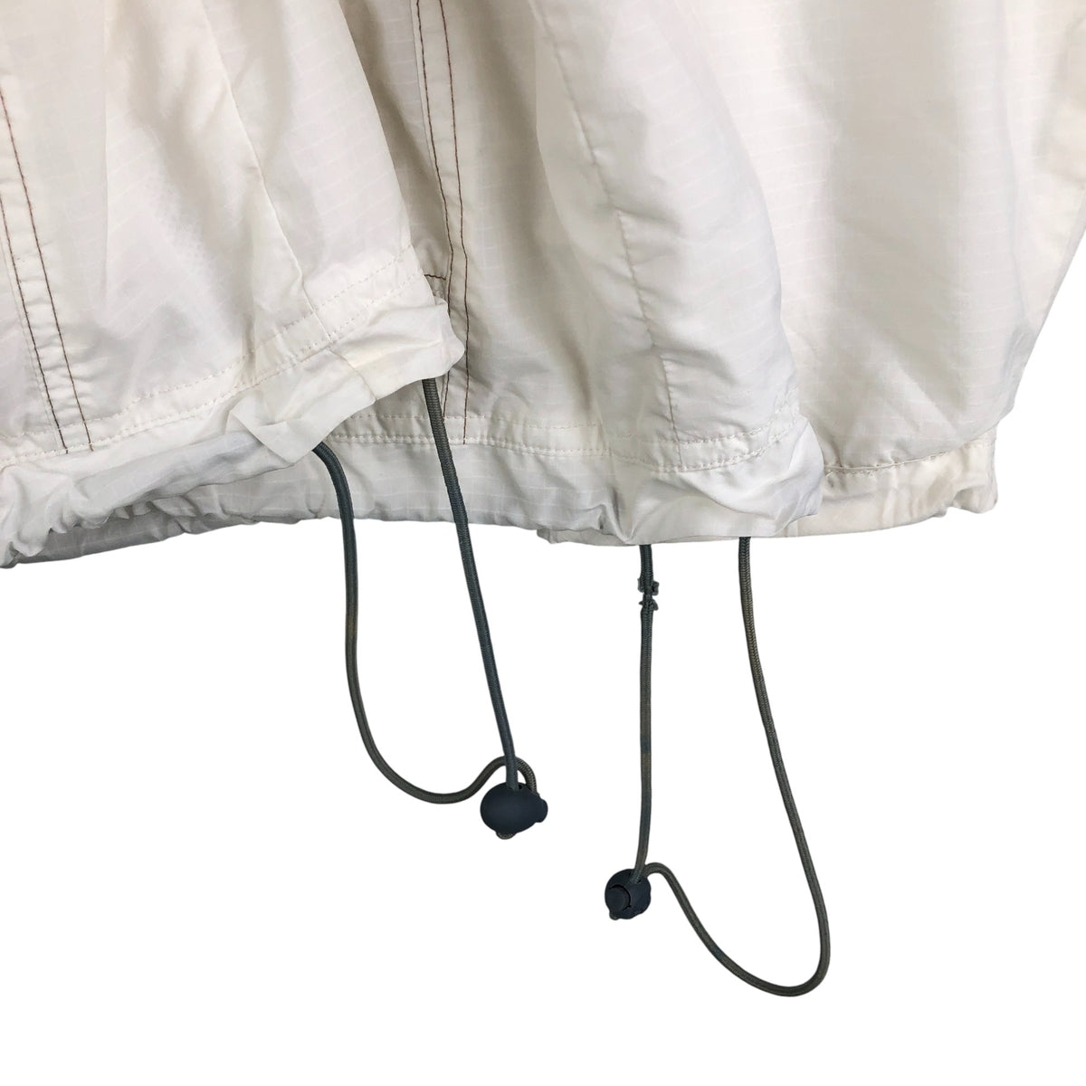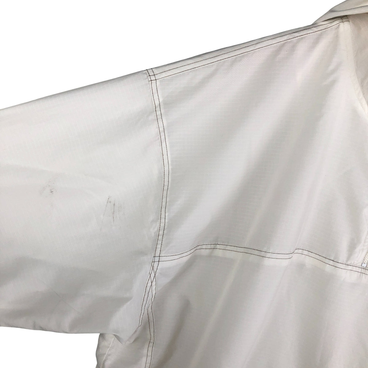 -Damage to front zip top. Stain on hood, right shoulder, right arm and abdomen. Damage to drawcords on both hemlines.