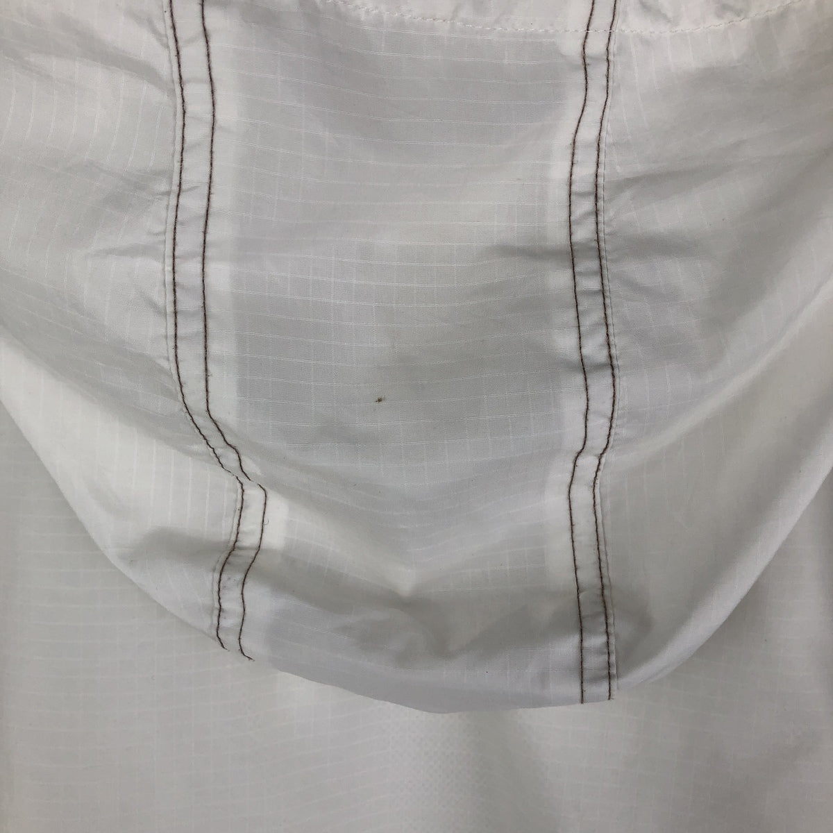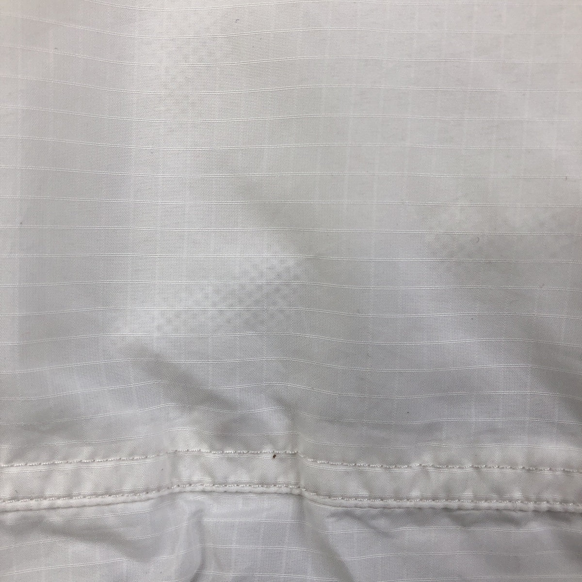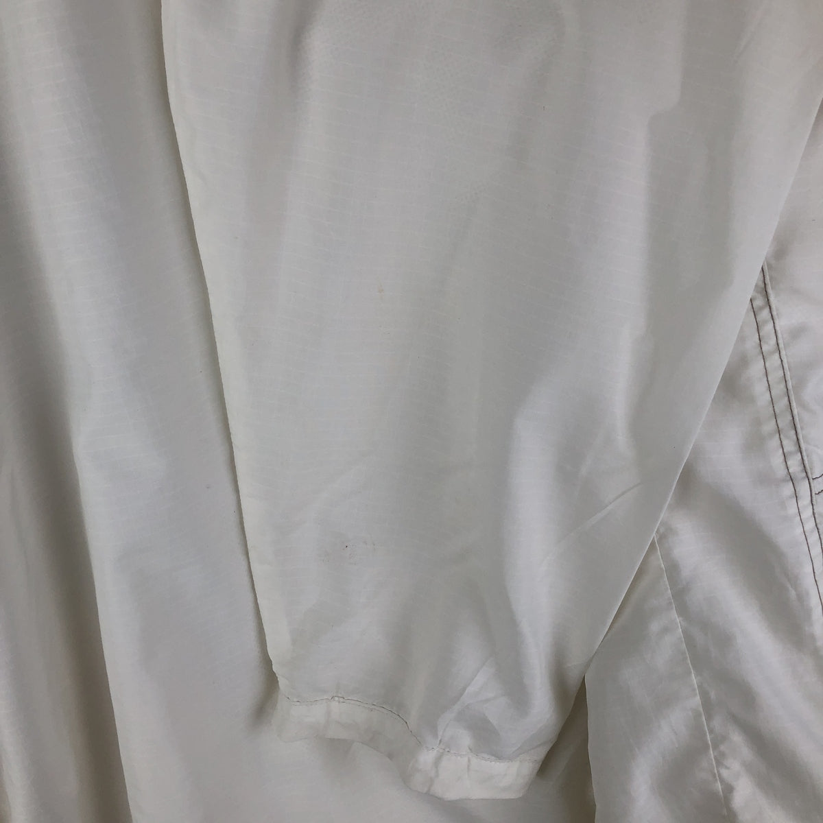 -Damage to front zip top. Stain on hood, right shoulder, right arm and abdomen. Damage to drawcords on both hemlines.