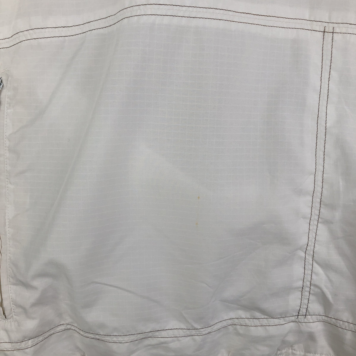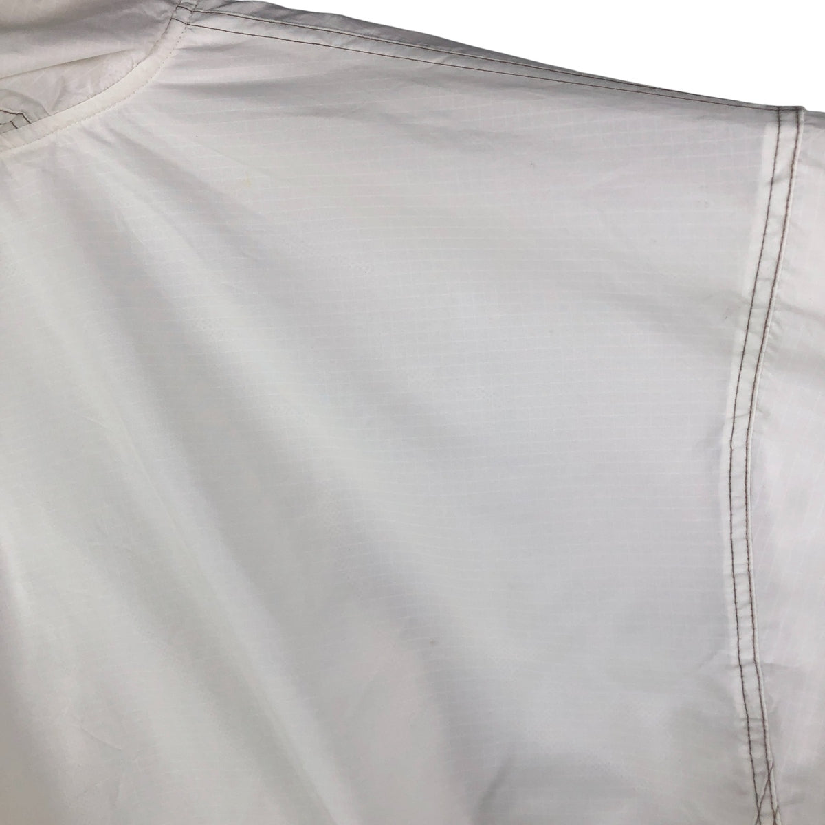 -Stain on the right arm, right shoulder and left hem. Thread pull on the left shoulder. Rubbing on the right arm.
