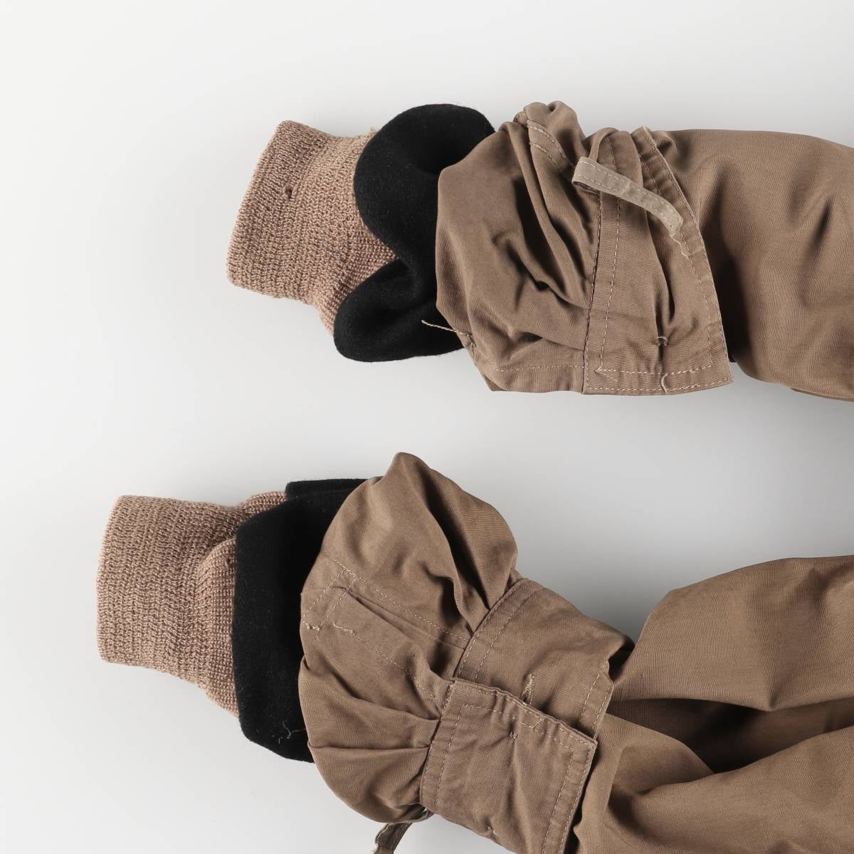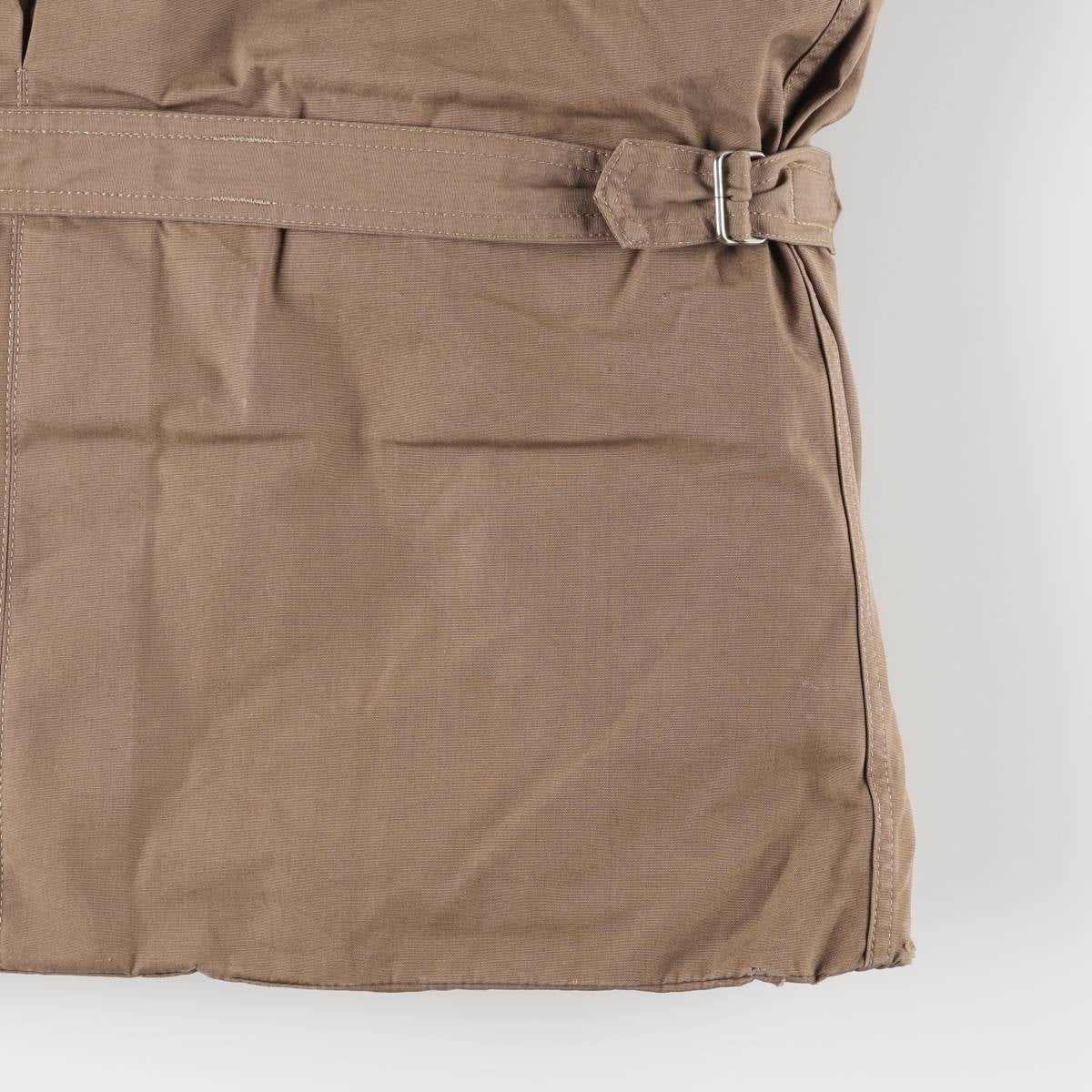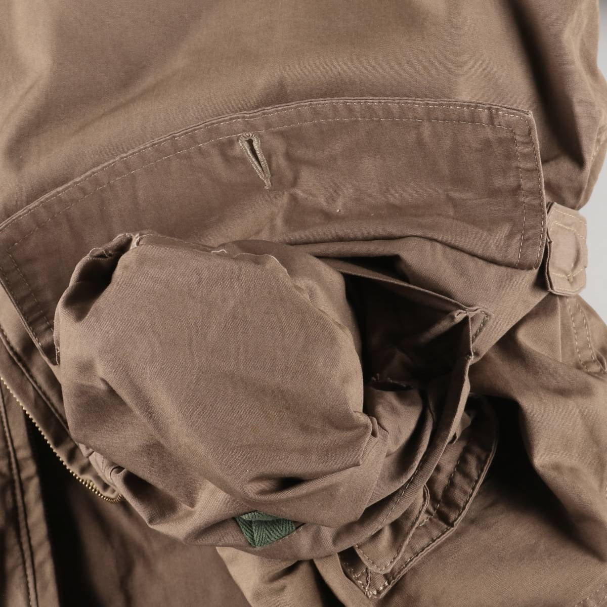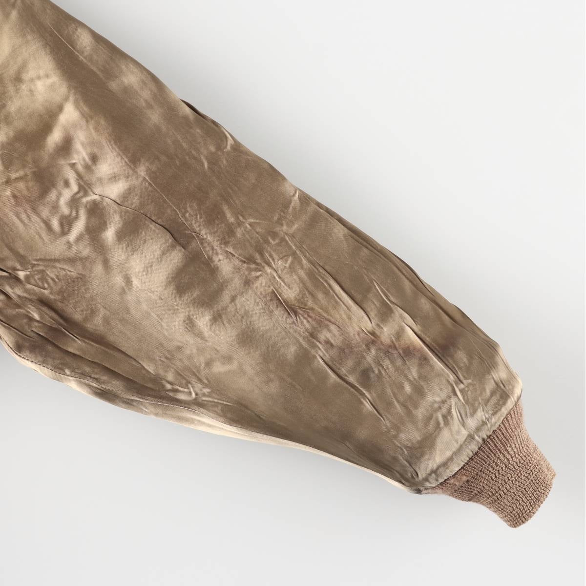 -Stain on the front, both sleeve forearms, right abdominal pocket, left abdominal pocket inner, and inside of both sleeve ends. Thread pull on right elbow. Tears on inside of both sleeve ends.