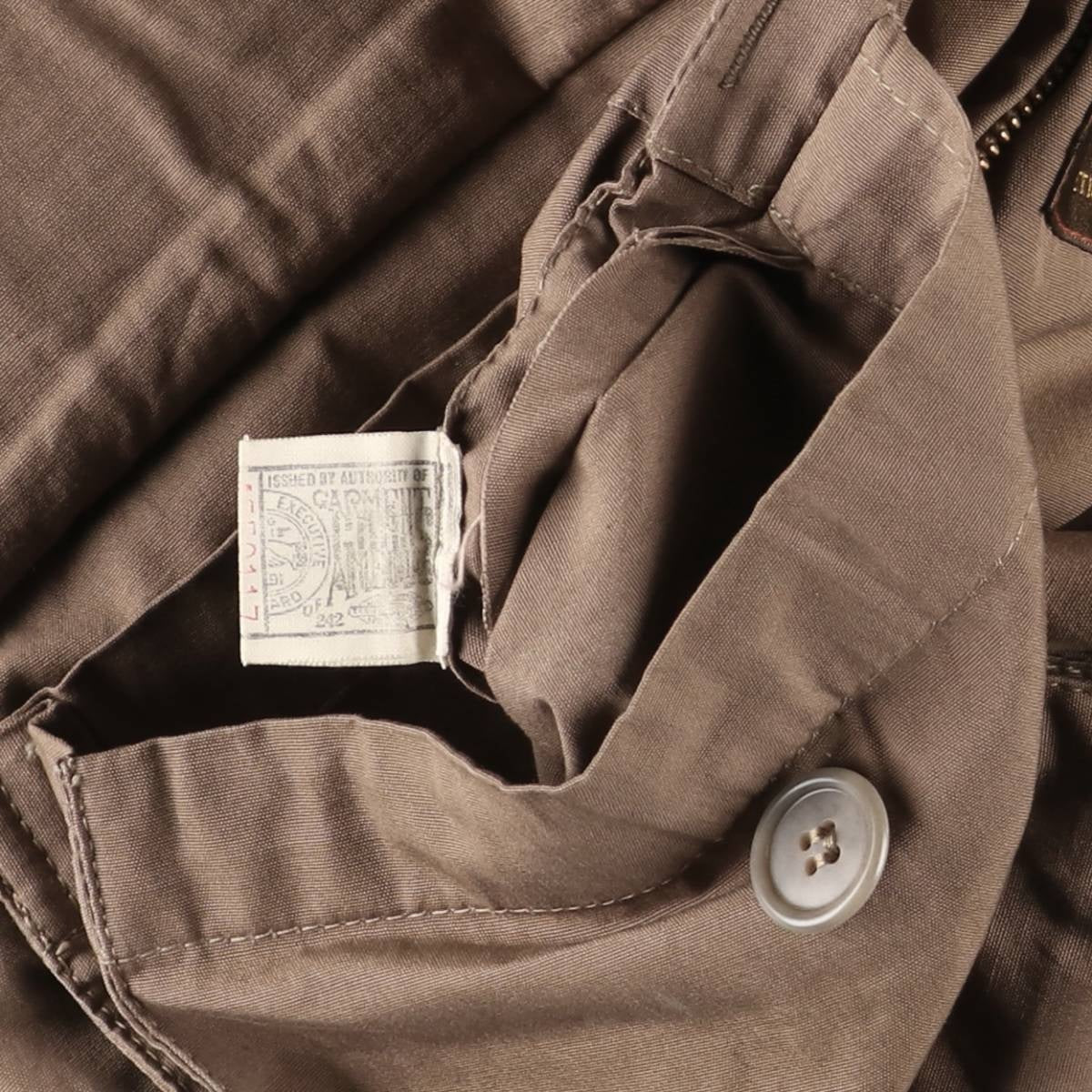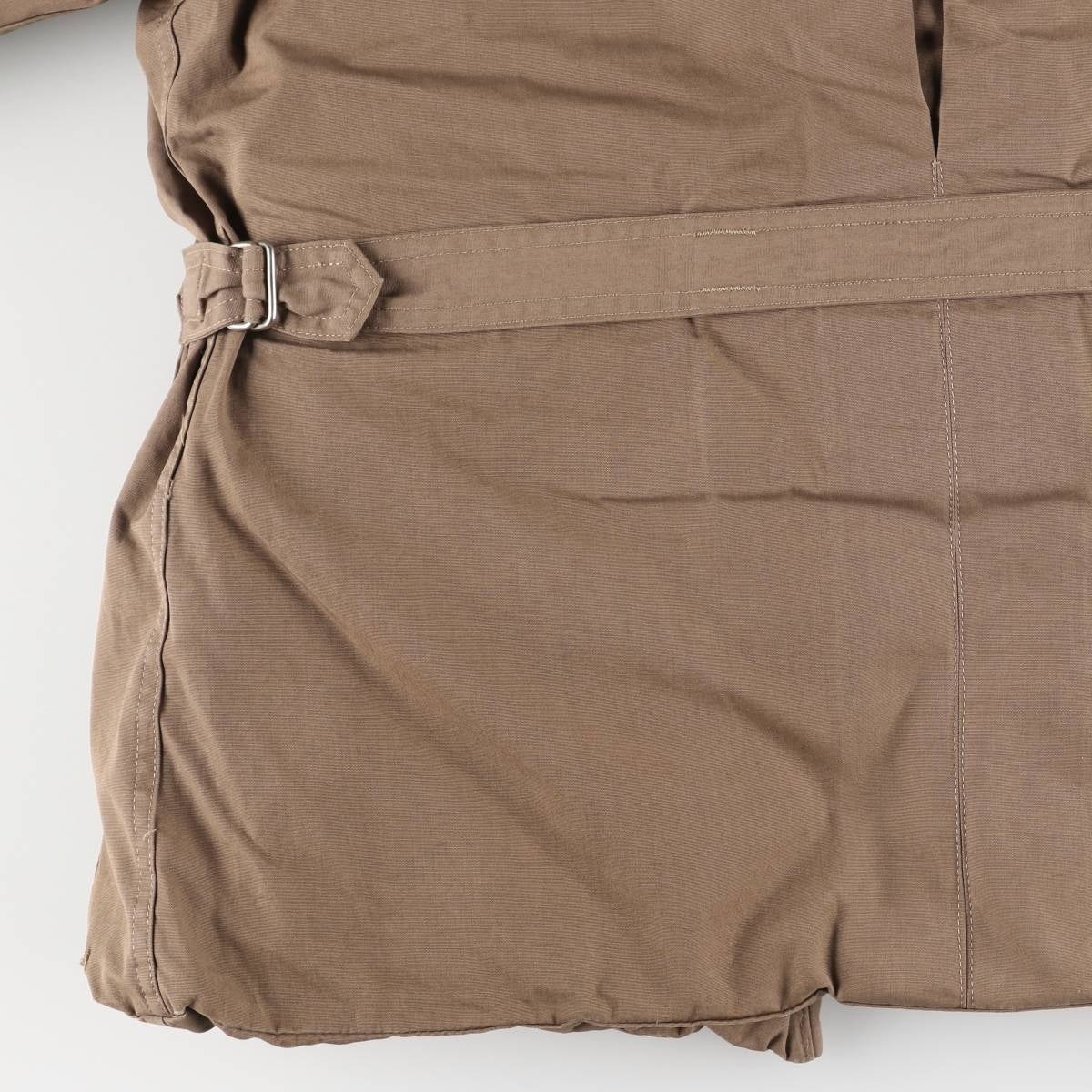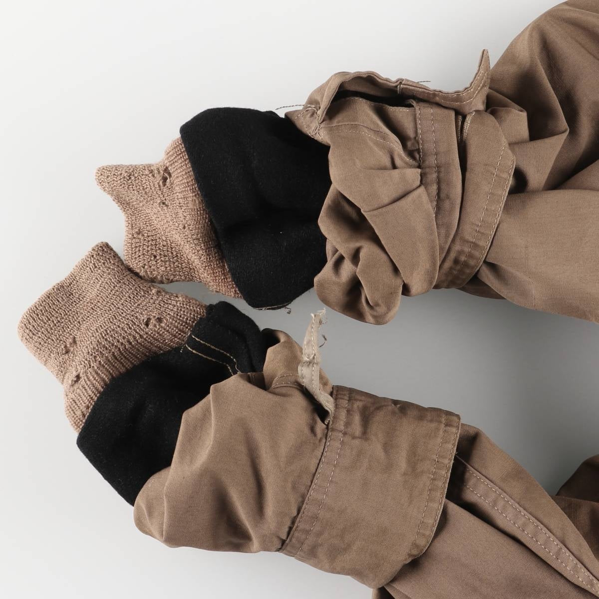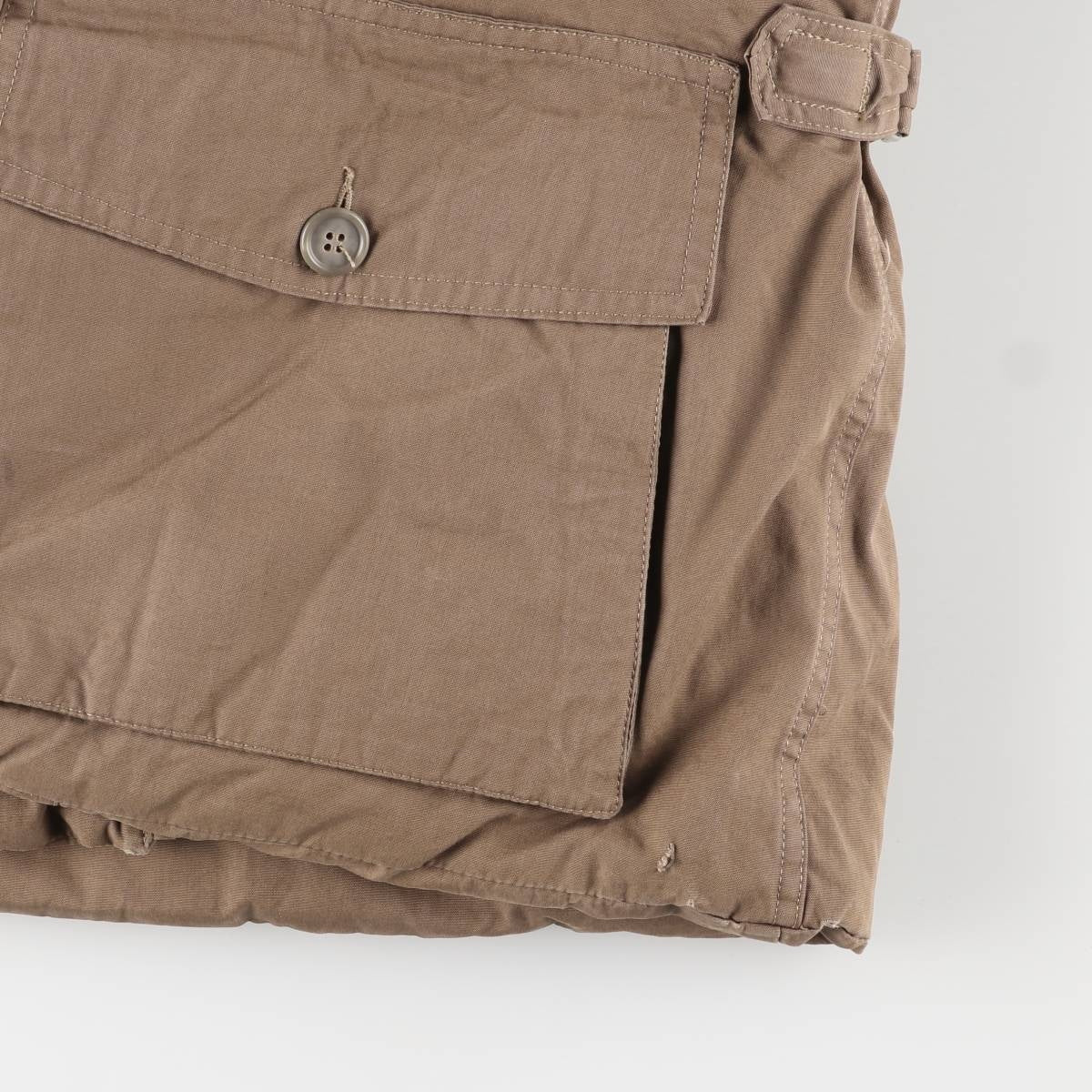 -Stain on the front, both sleeve forearms, right abdominal pocket, left abdominal pocket inner, and inside of both sleeve ends. Thread pull on right elbow. Tears on inside of both sleeve ends.