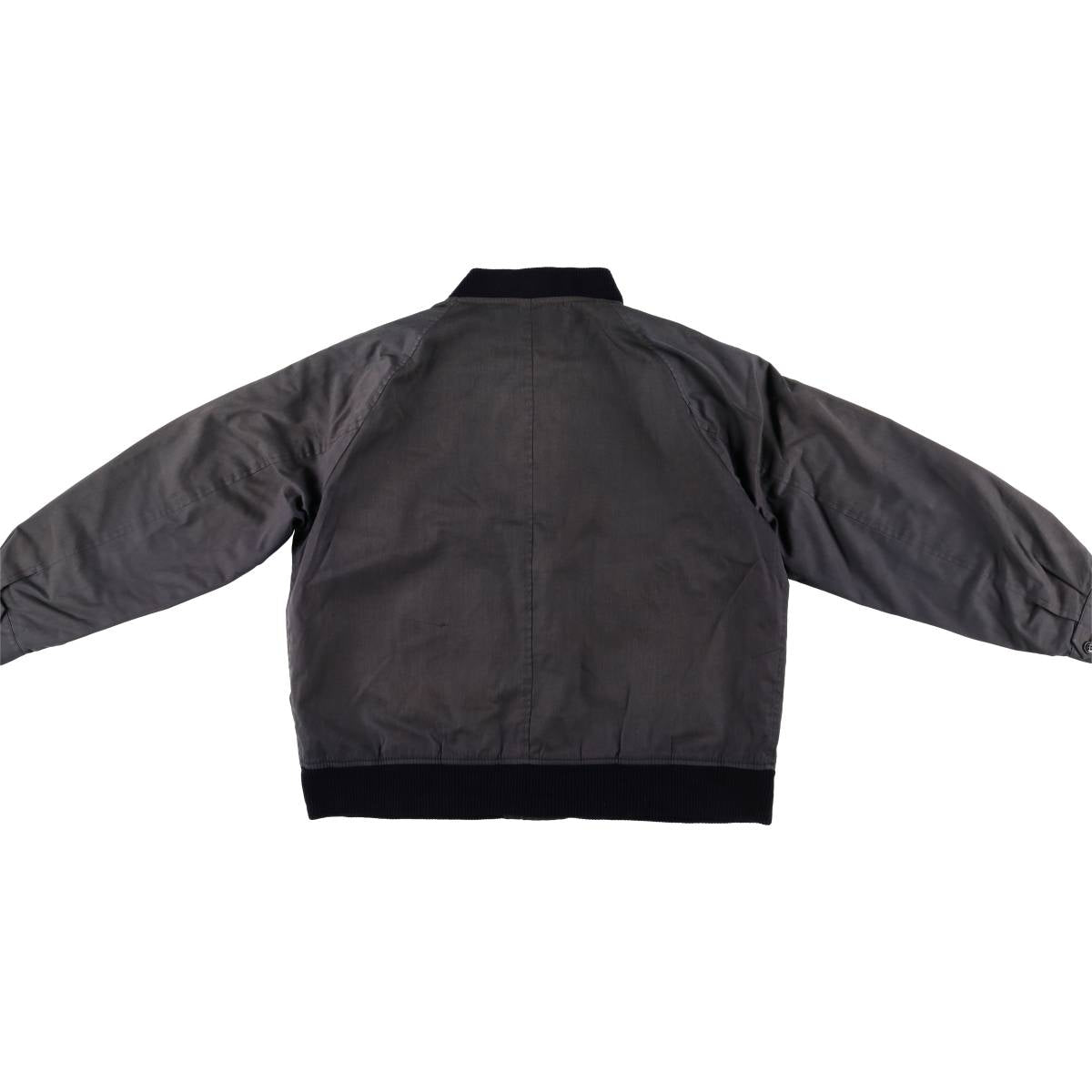 -Rear, tear at upper left waist, rubbing at left and right sleeve ends