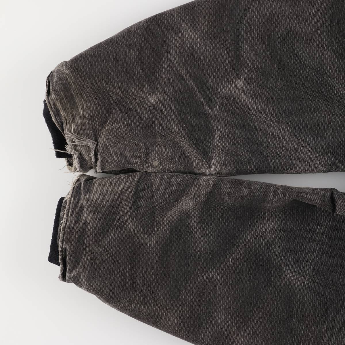 -Rear, left and right sleeve ends torn, left and right hems, left arm, right sleeve end rubbed