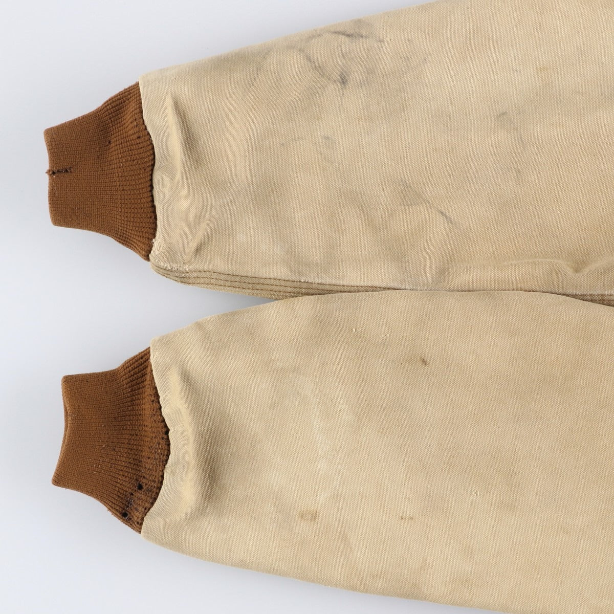 -Hole on left hem and right sleeve end, tear on right hem and right sleeve end, rubbed on right arm and left sleeve end, burnt on left sleeve end