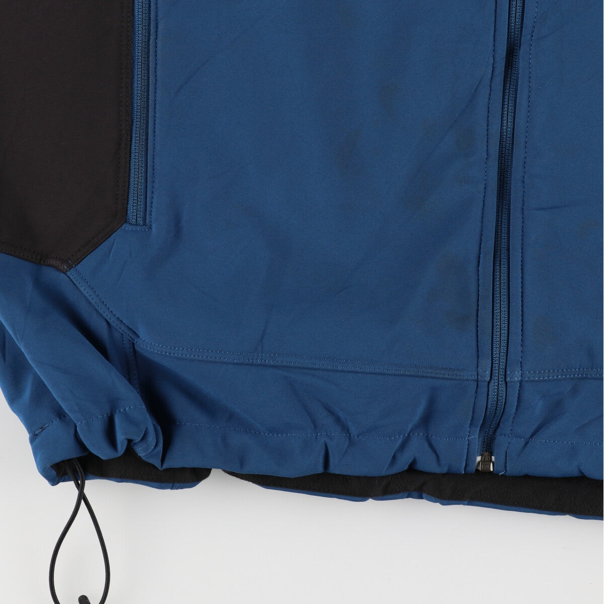 - Stains on the front, left shoulder, chest, abdomen, hem and both cuffs