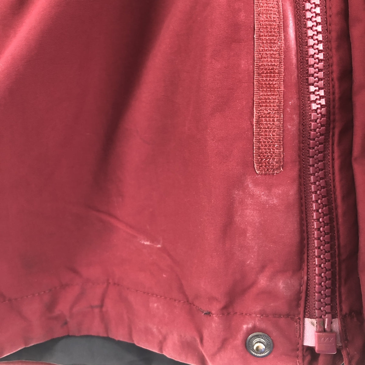 - Rear hood missing, zipper marks