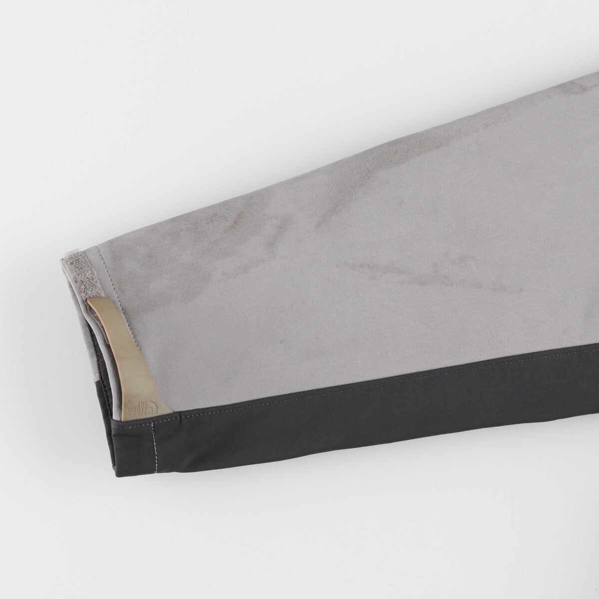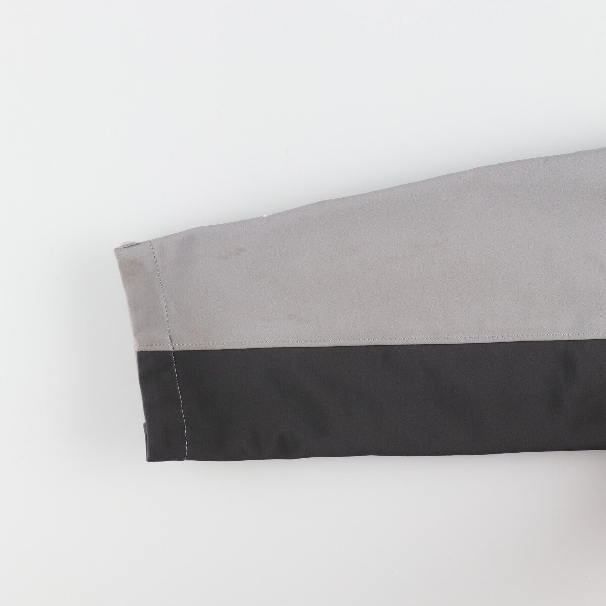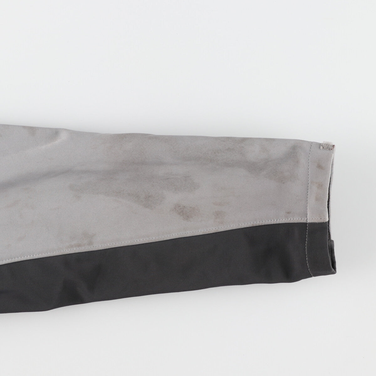 -Stain on the front, right sleeve and under the zipper.