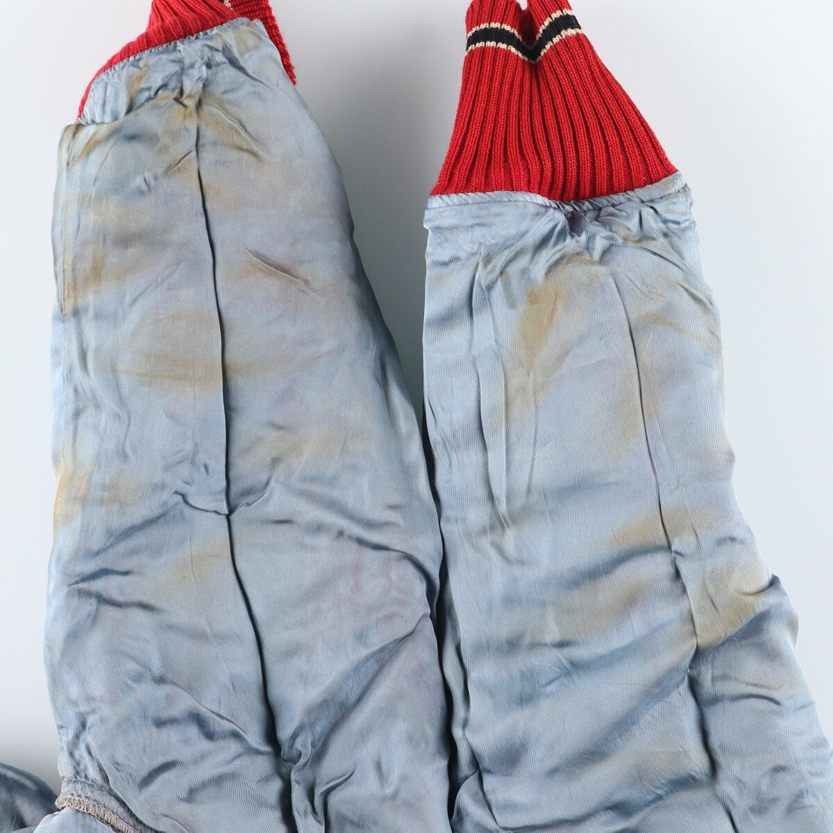 - Stains on the front, right shoulder, neck, left chest, both pockets, and inside both pockets