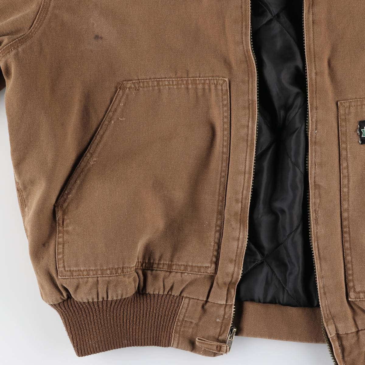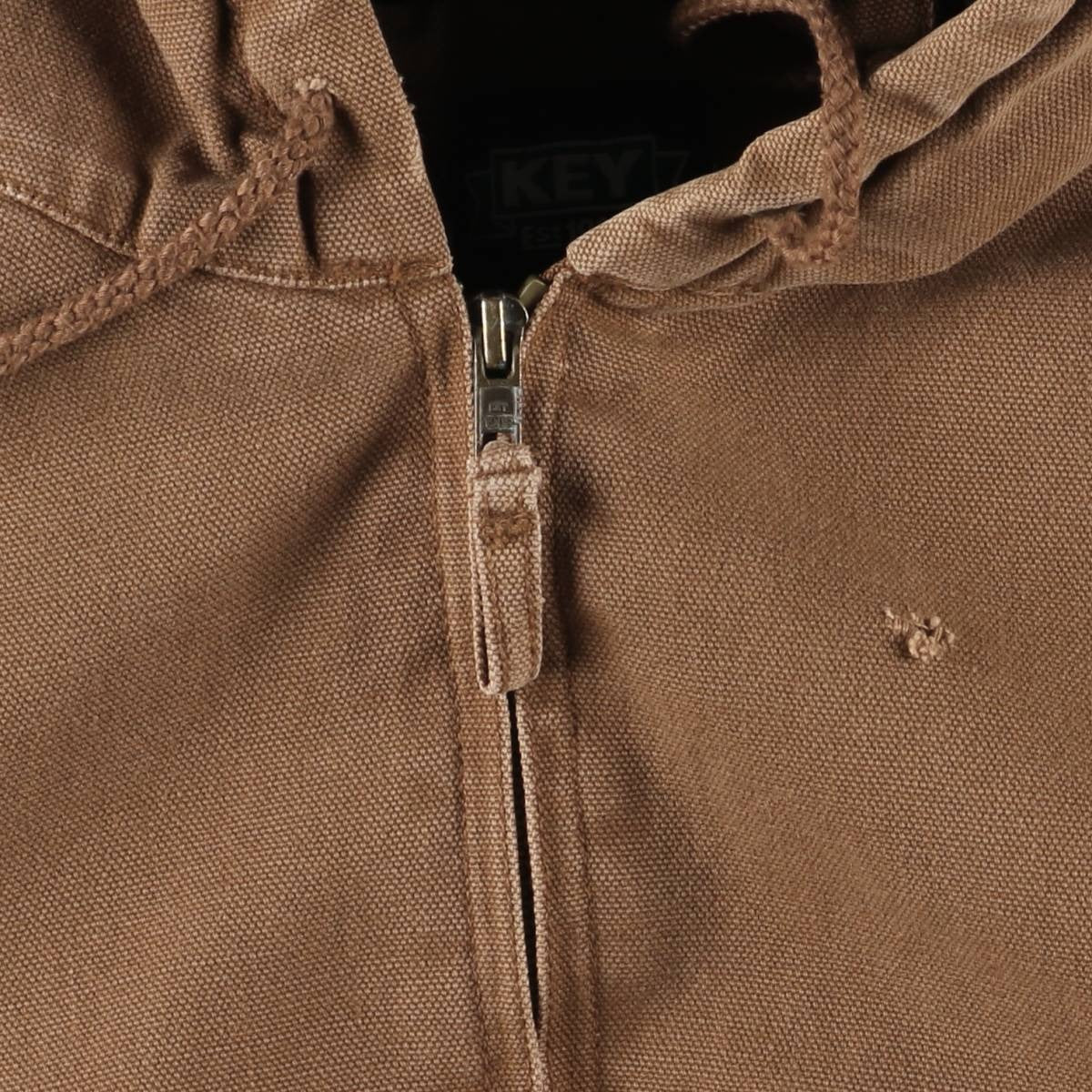 -Scuffs on front and left shoulder, stains on right chest, left abdomen and hem, discoloration on left sleeve end, hole on right sleeve end, repair marks and frayed threads on abdomen, plastic missing at right hood adjustment string end