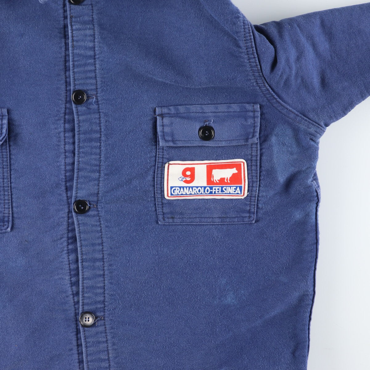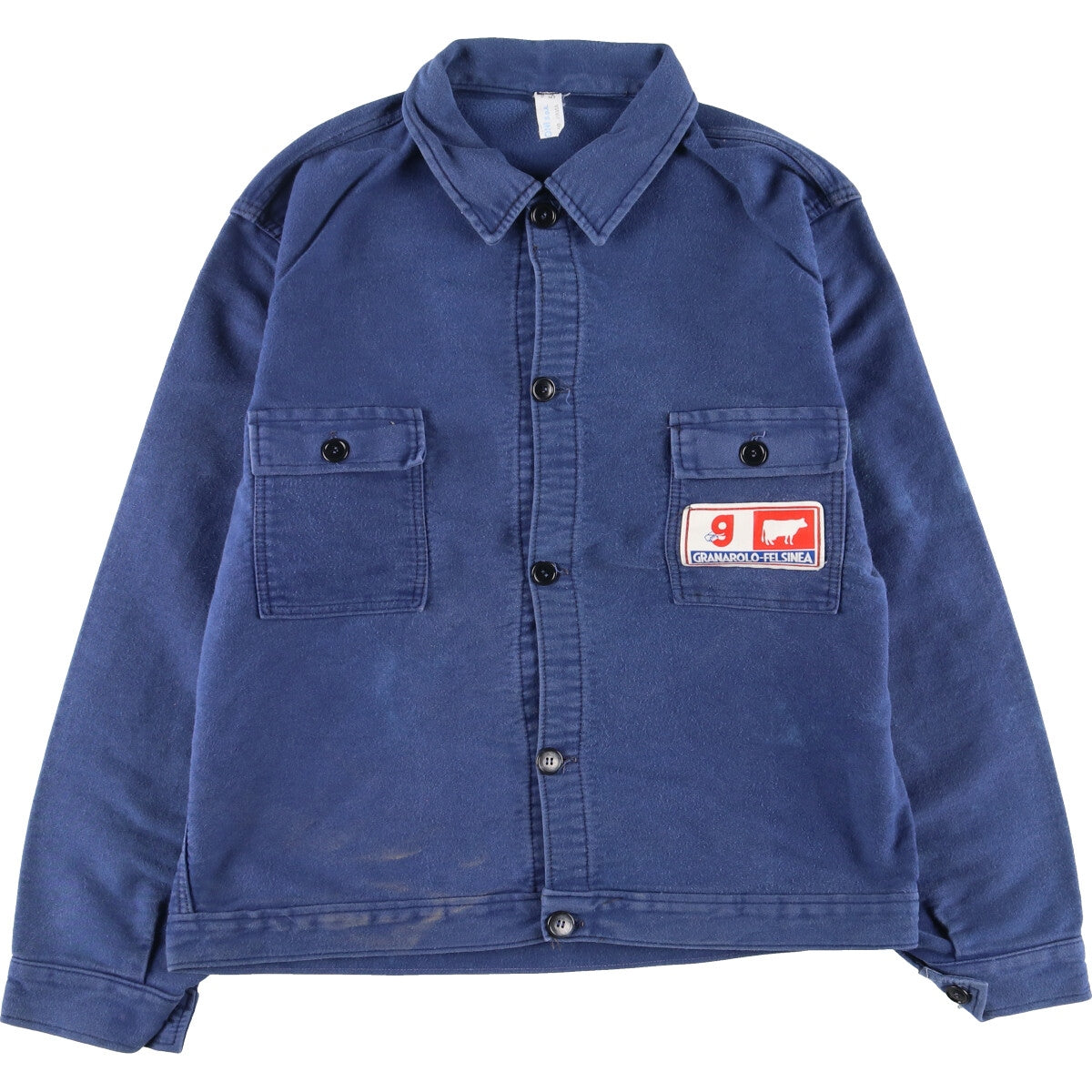 - Front, 4th and 5th buttons and right cuff button replaced, stain on left arm, left chest and left abdomen