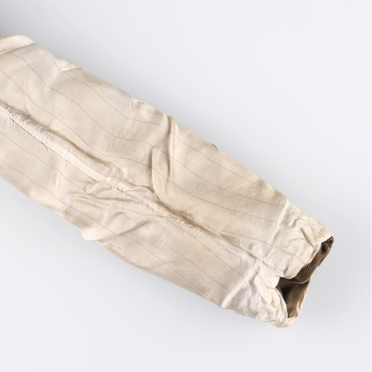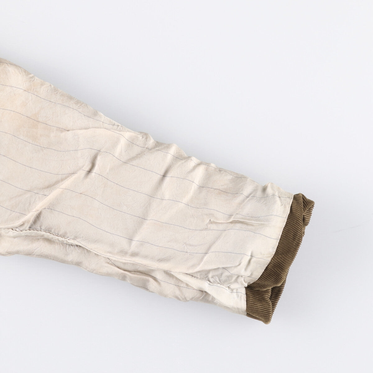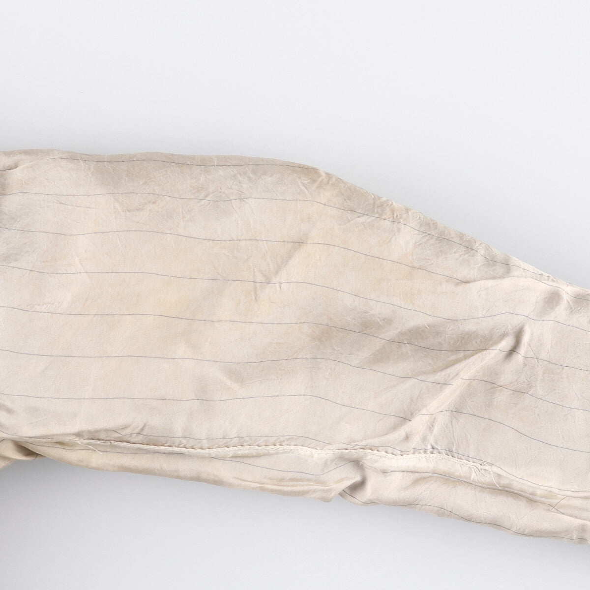 -Stain on inner, left and right arms, left and right sleeve ends, right hem. Repair marks on left arm.