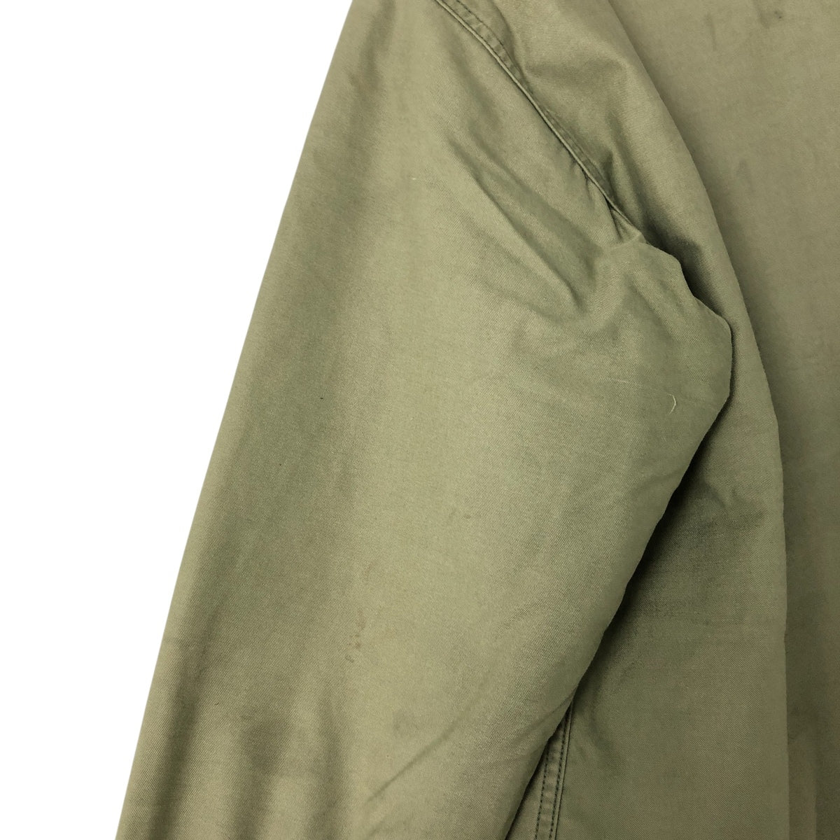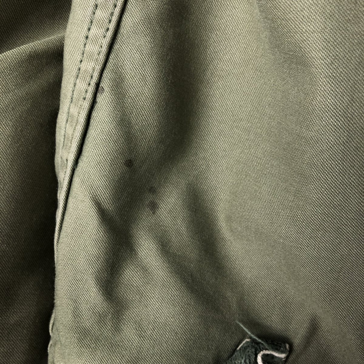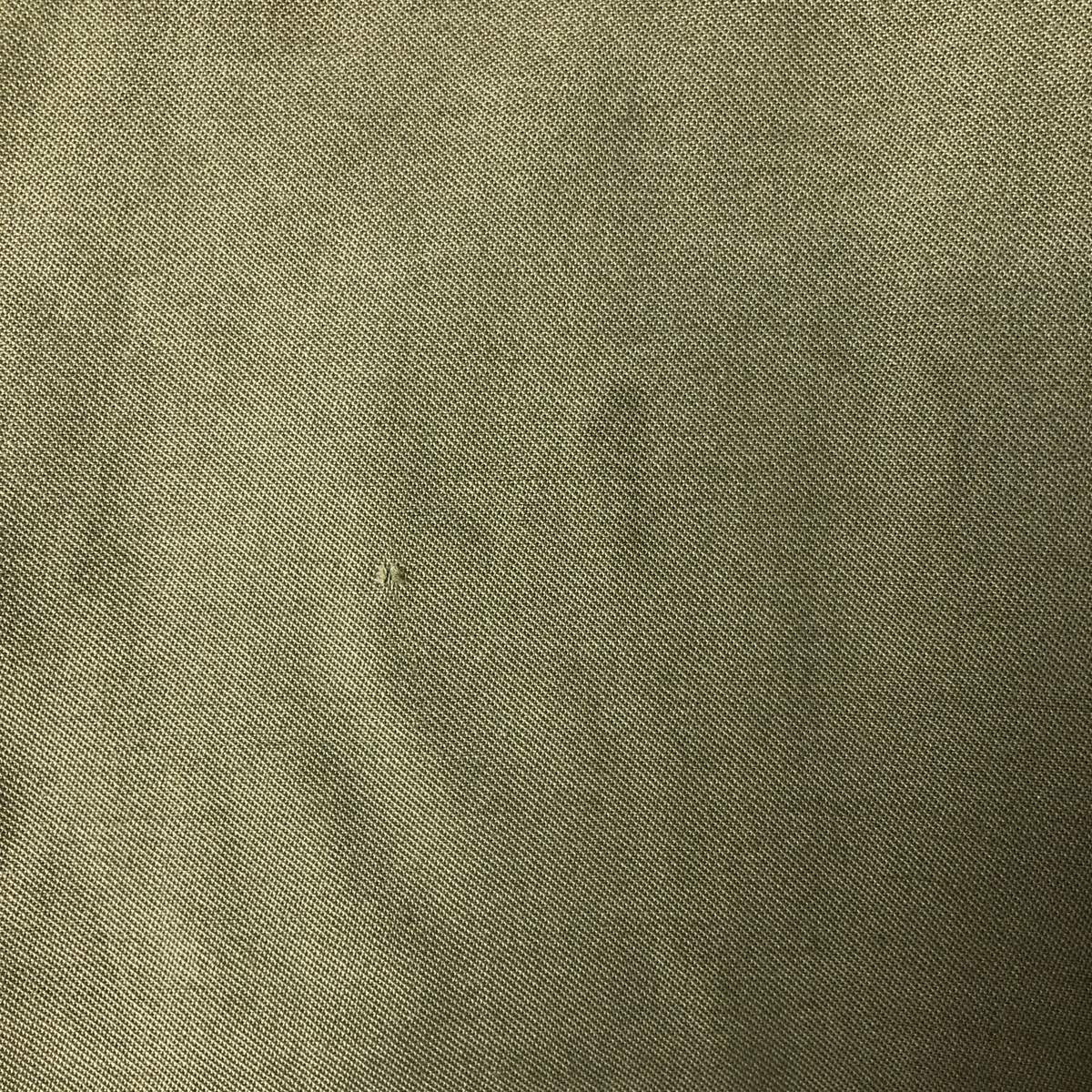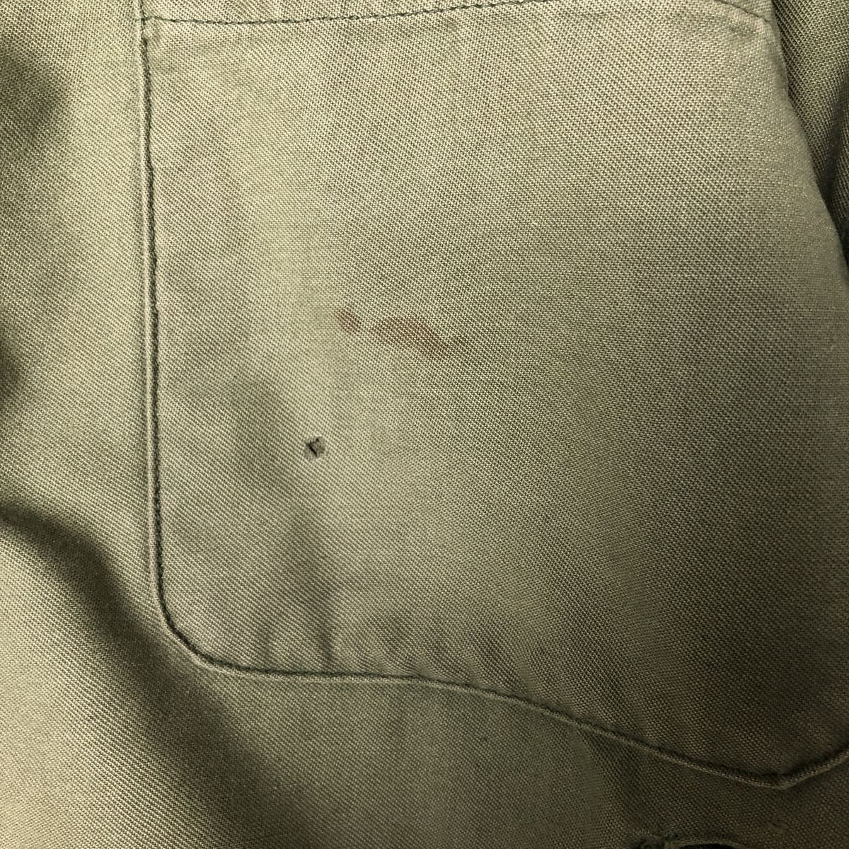 -Front zipper unusable. Zipper end tape peeling. Zipper top replaced. 1st, 2nd, 4th and 5th buttons replaced. Repair marks on both sleeve ends. Fray on neck (under the placket). Right chest, both arms, both sleeve ends, abdomen, hem and left abdomen pocket stain.