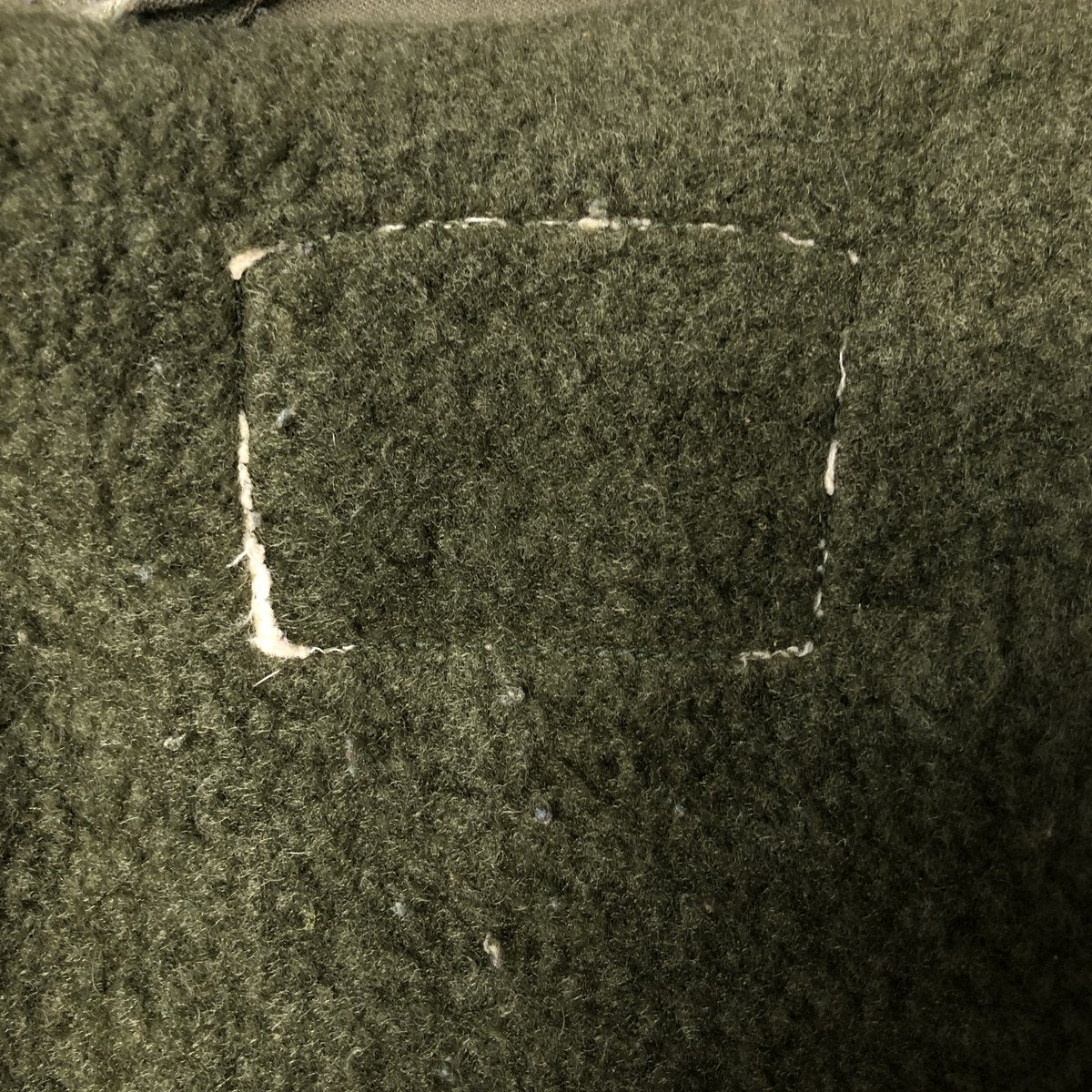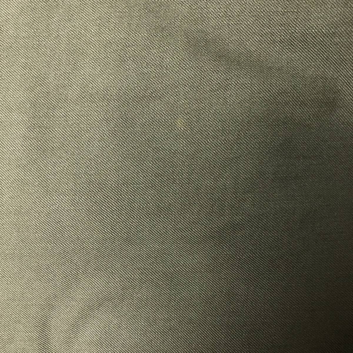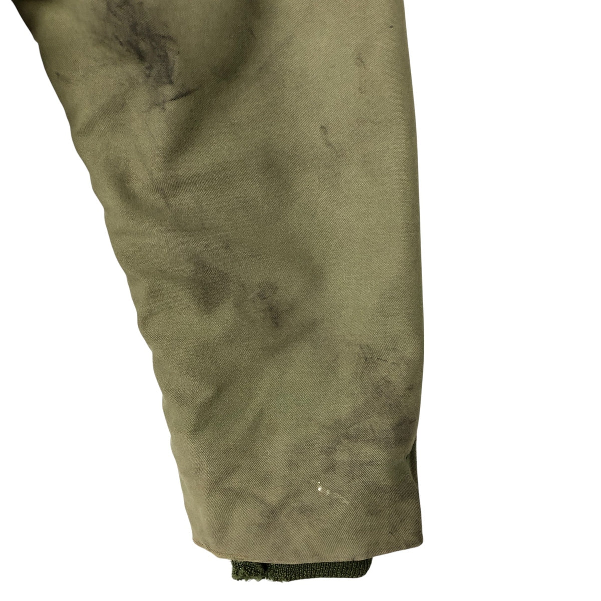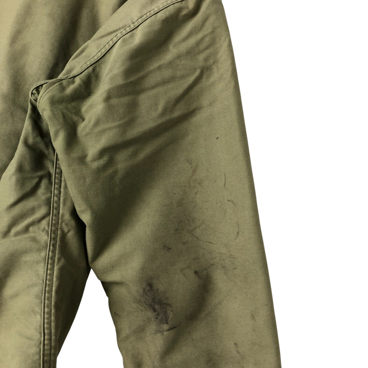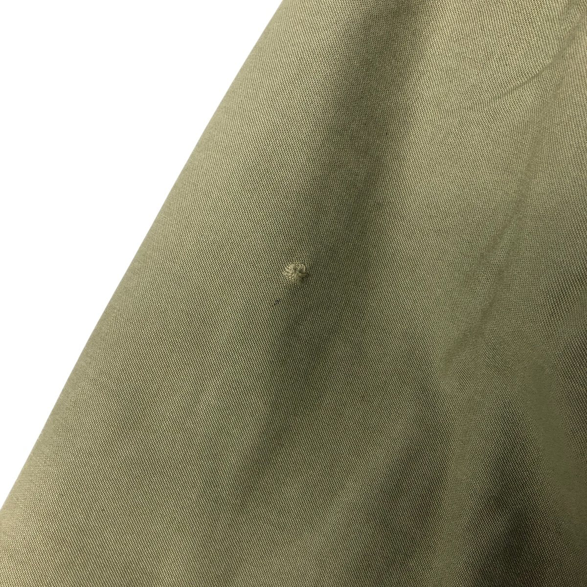 -Front zipper unusable. Zipper end tape peeling. Zipper top replaced. 1st, 2nd, 4th and 5th buttons replaced. Repair marks on both sleeve ends. Fray on neck (under the placket). Right chest, both arms, both sleeve ends, abdomen, hem and left abdomen pocket stain.