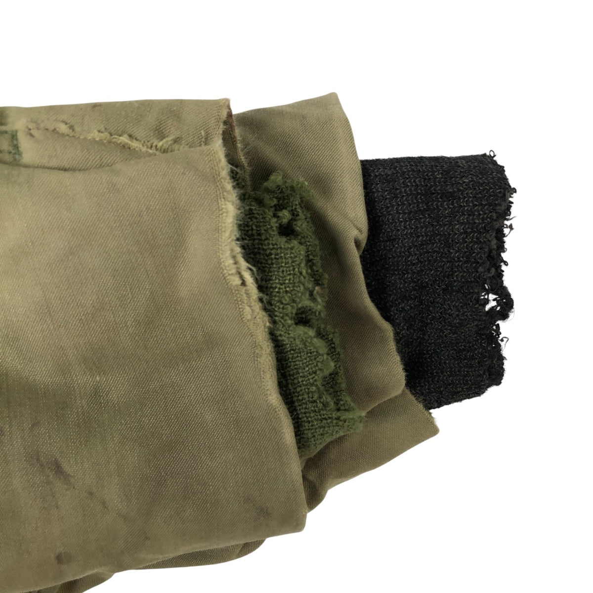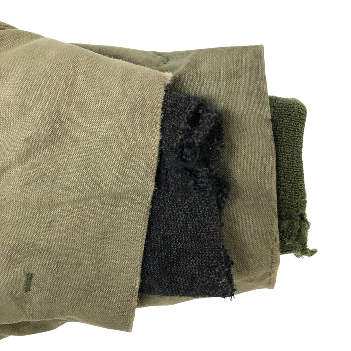 -Rip at the end of the right sleeve, repair marks at the end of the left sleeve, stains on the neck and hem, wood chips on the abdomen
