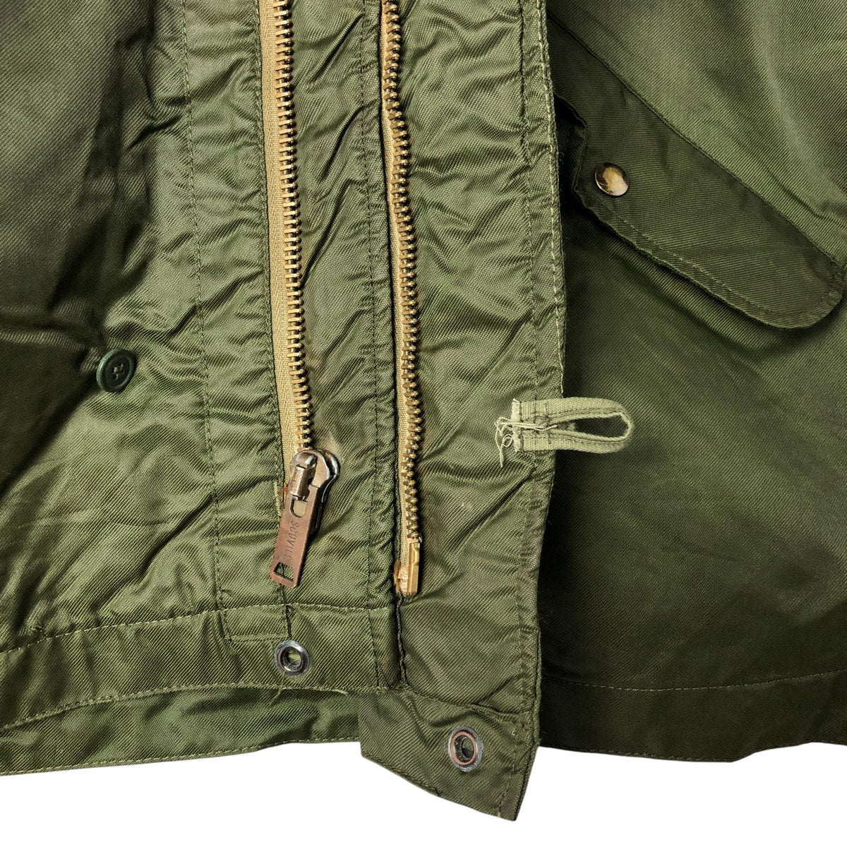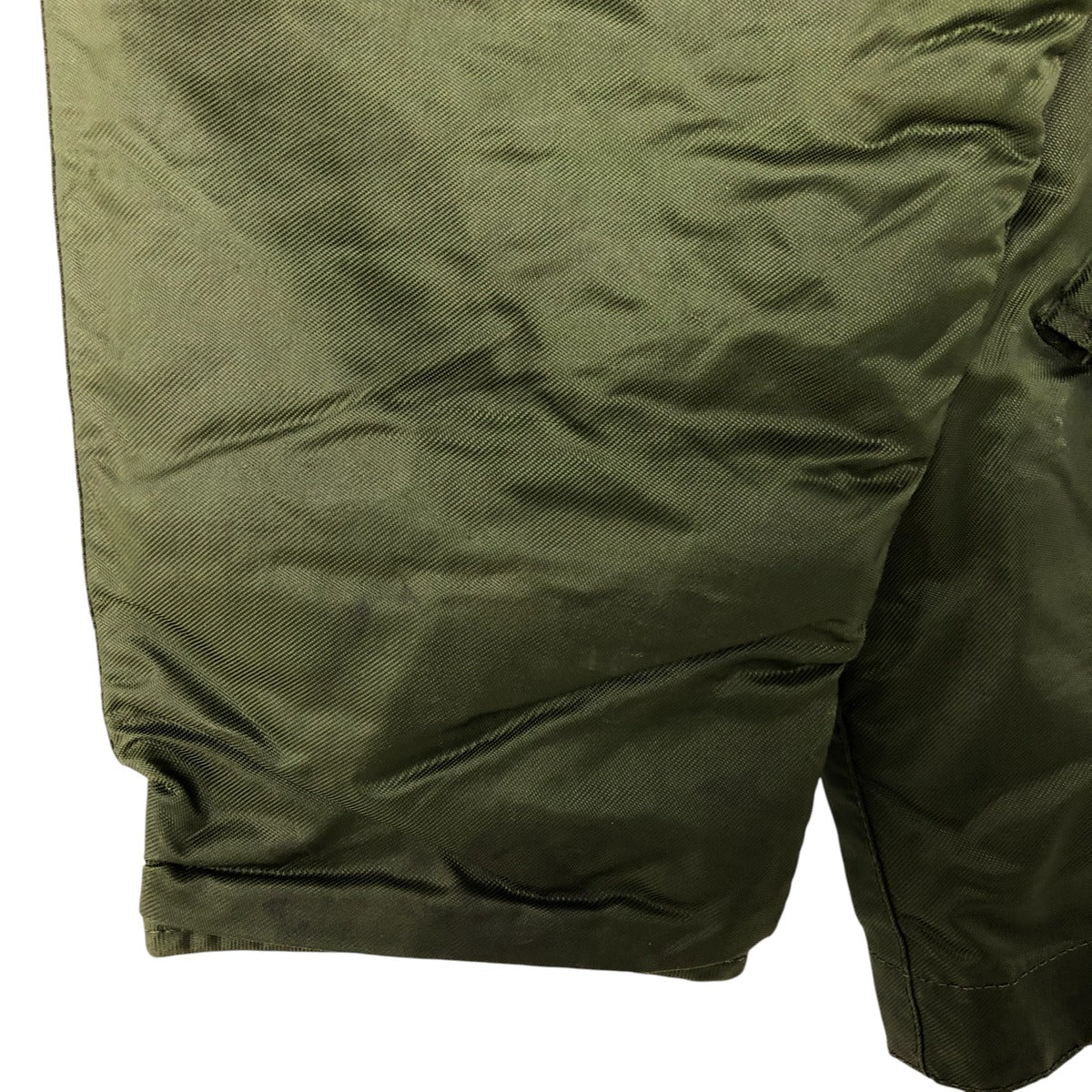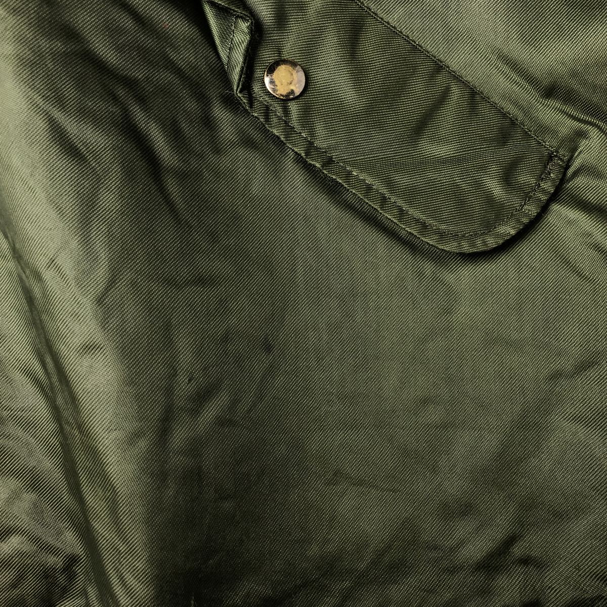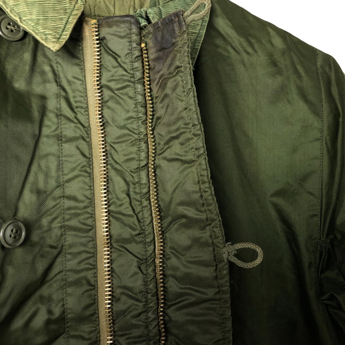 -Stain on the front, both sleeves, both arms, both collars, left chest, left abdomen, left hem, inside both abdominal pockets, inside the placket, and inside both sleeves. Scratches on the left sleeve and both collars. Tears on the left arm, zipper line, and zipper end tape. Repair marks on the first and second buttons from the bottom.