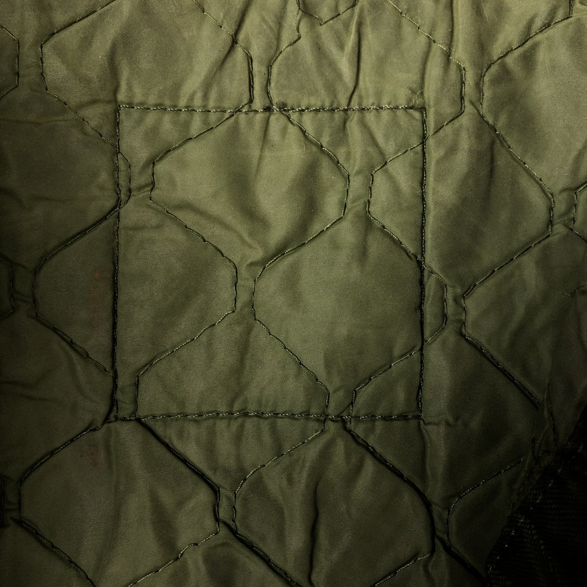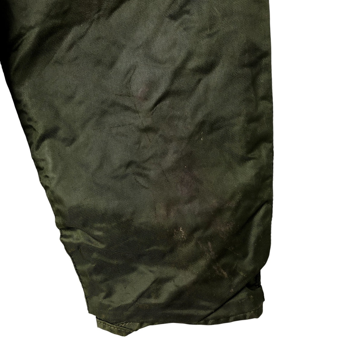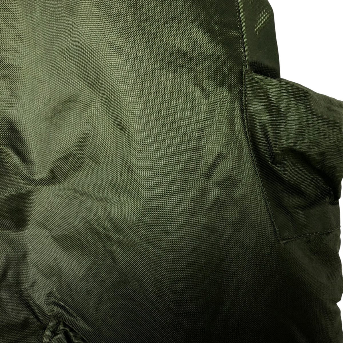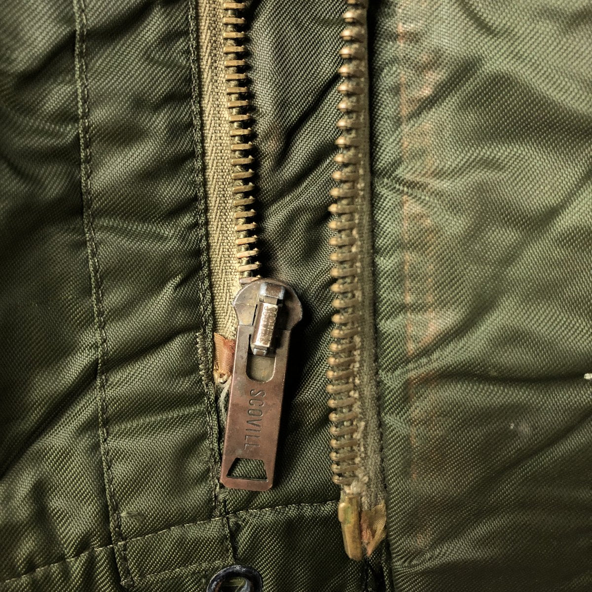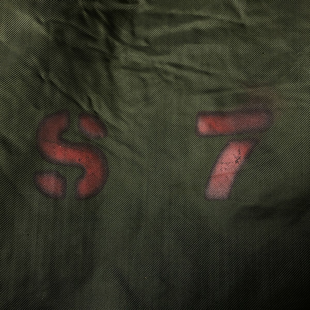 -Stain on the front, both sleeves, both arms, both collars, left chest, left abdomen, left hem, inside both abdominal pockets, inside the placket, and inside both sleeves. Scratches on the left sleeve and both collars. Tears on the left arm, zipper line, and zipper end tape. Repair marks on the first and second buttons from the bottom.