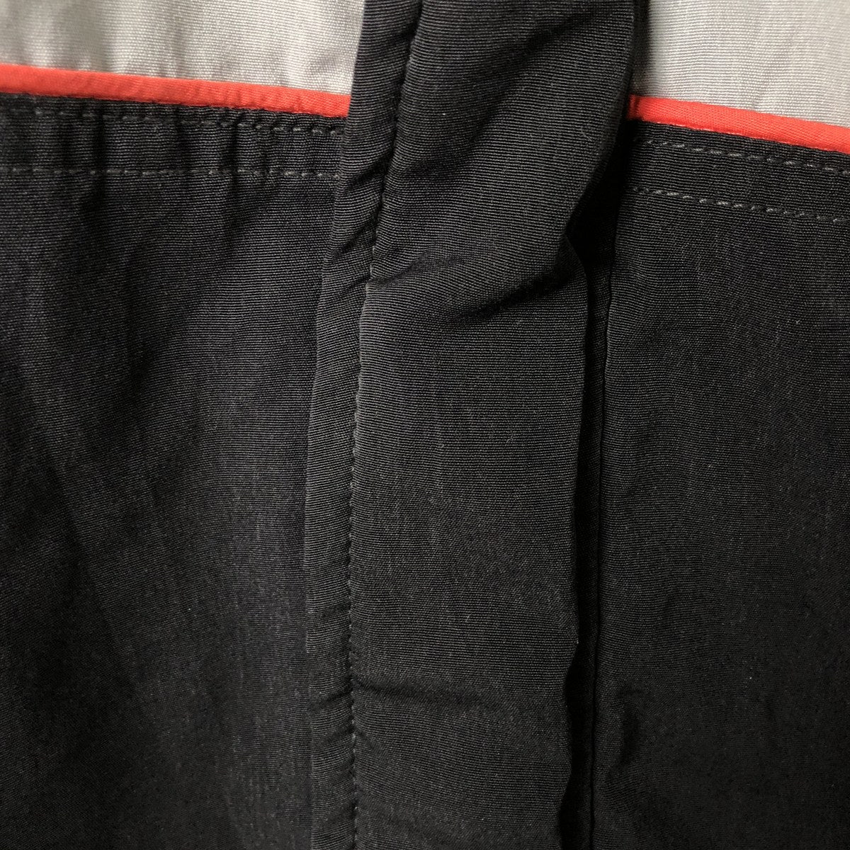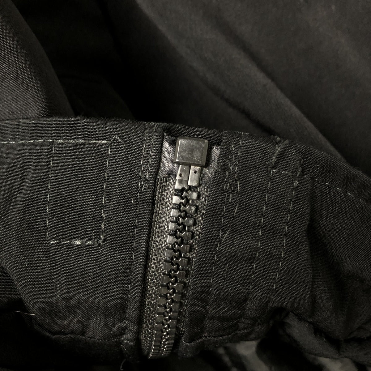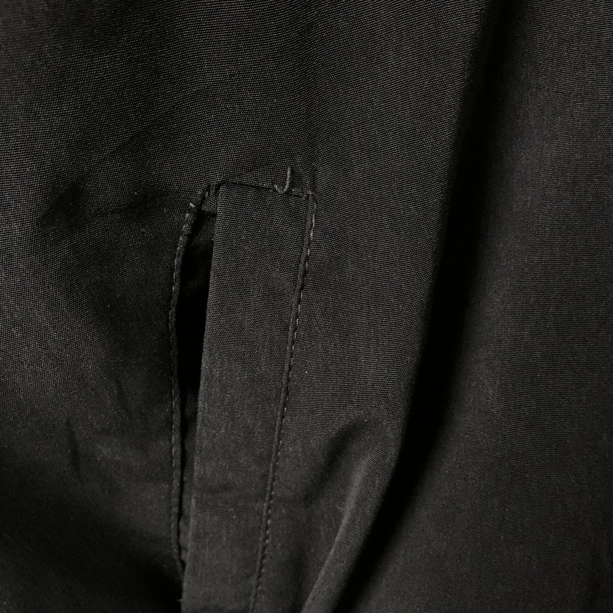 -Stain on front and chest, repair marks on hem and both pocket openings, rubbed on left shoulder and abdomen, peeling of zipper end tape, tear on left arm, loose thread on left arm and both pocket openings, fray on right arm