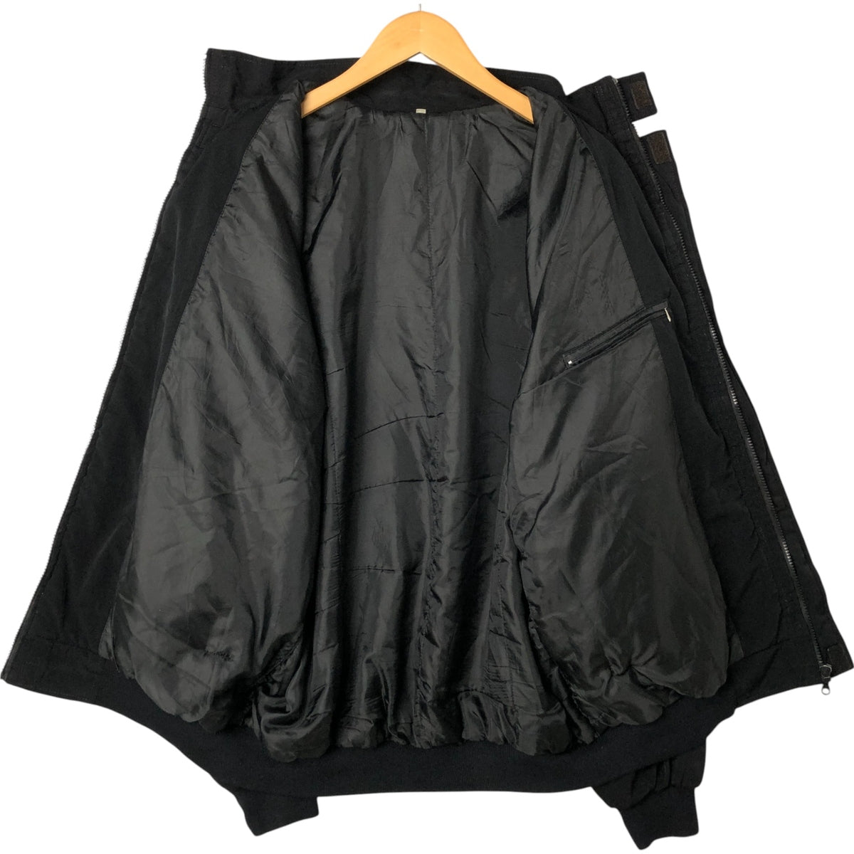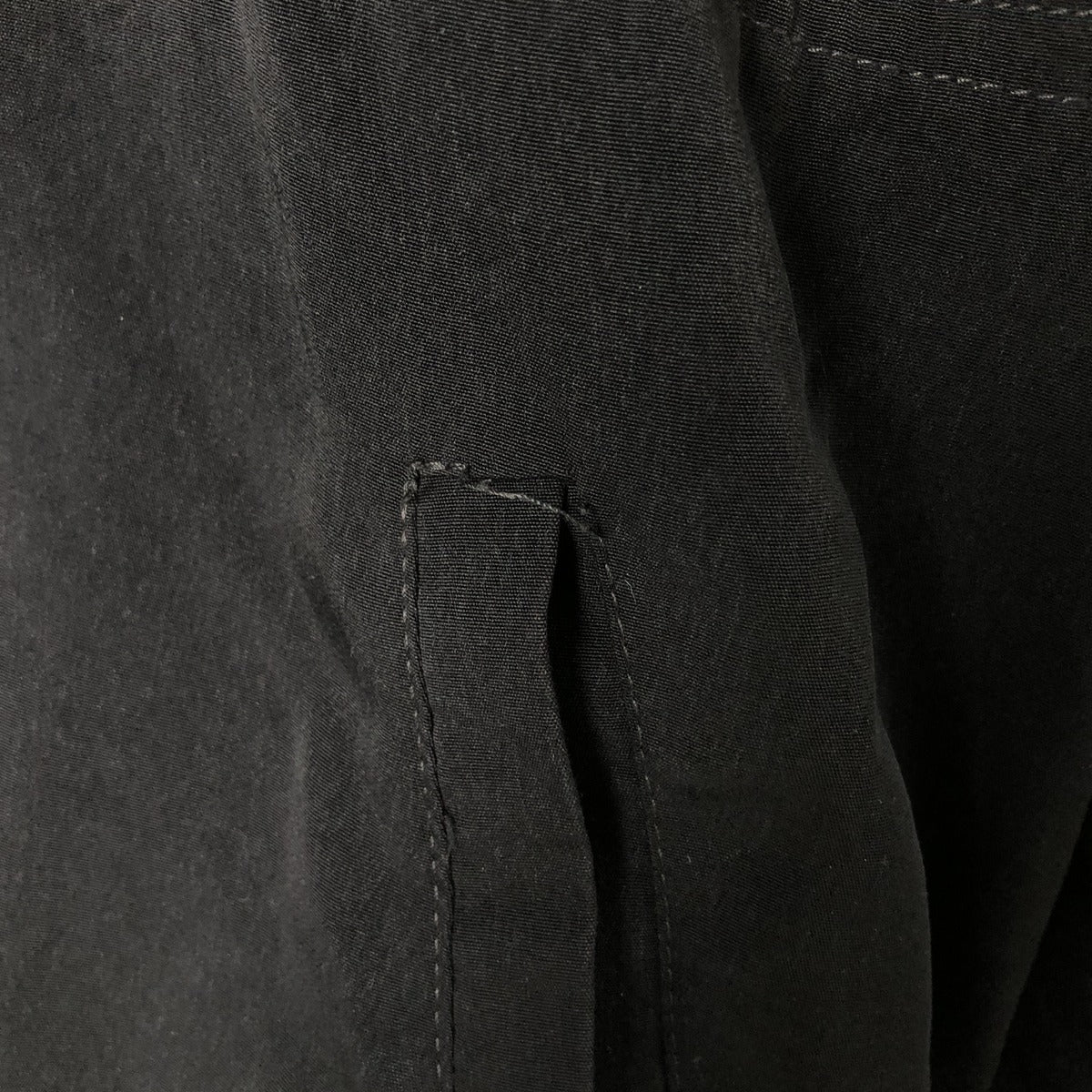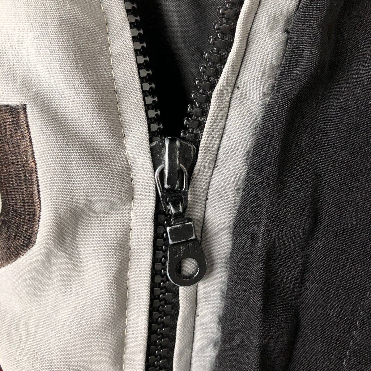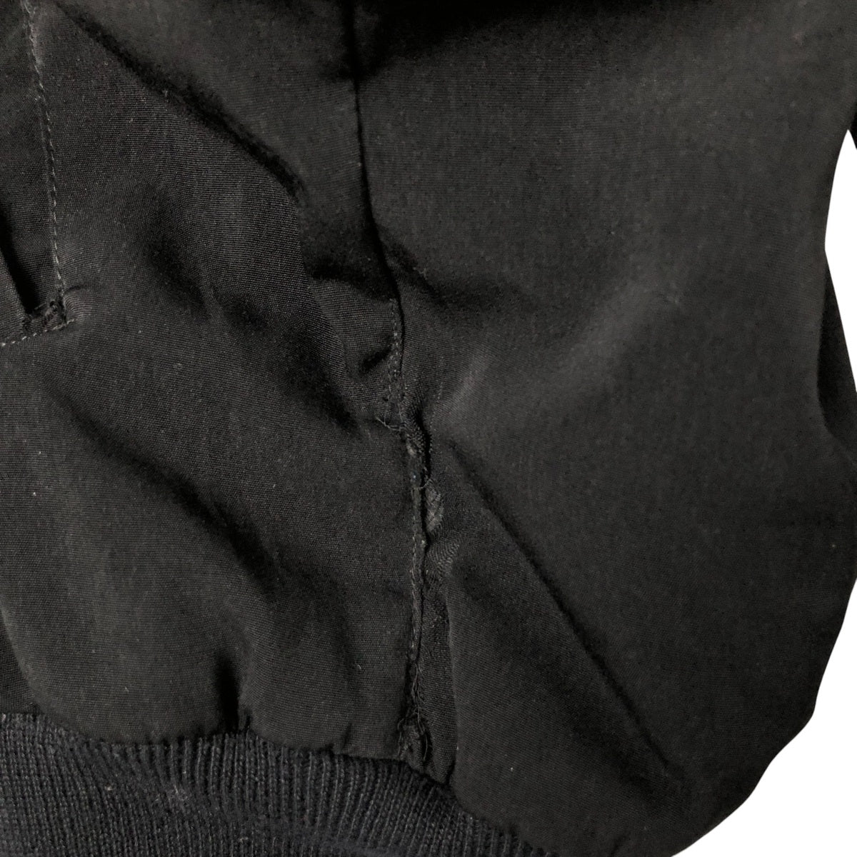 -Stain on front and chest, repair marks on hem and both pocket openings, rubbed on left shoulder and abdomen, peeling of zipper end tape, tear on left arm, loose thread on left arm and both pocket openings, fray on right arm
