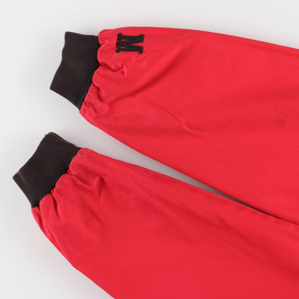 - Side B (red): stain on front, neckline, zipper area, left arm, both cuffs, abdomen, and hem. Rubbing on both cuffs.