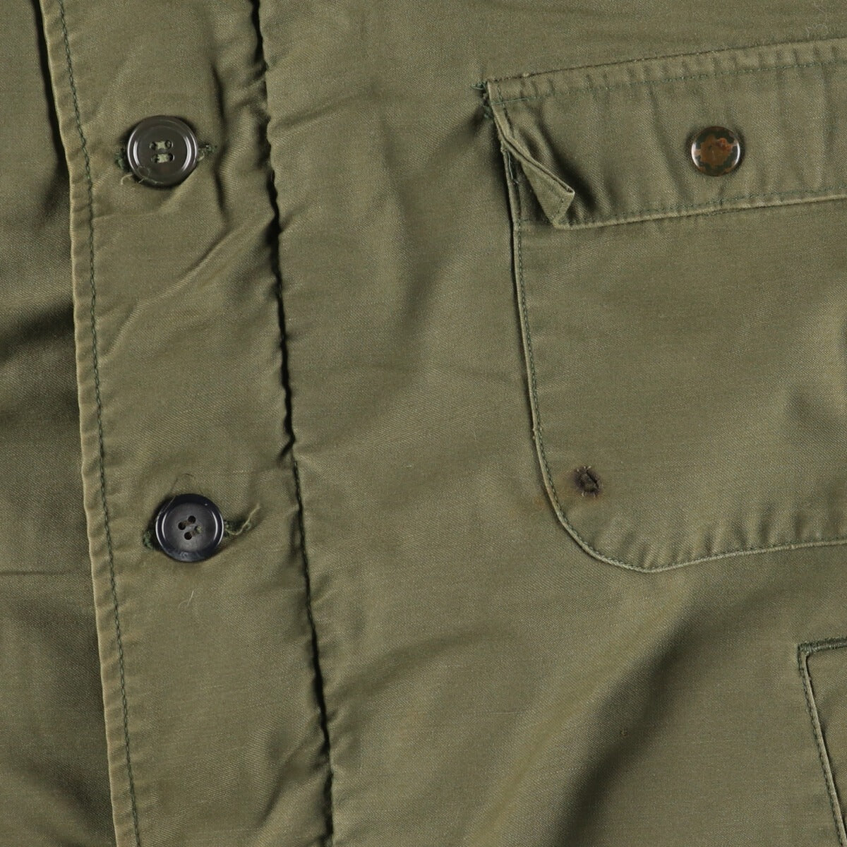 - Repair marks on front and zip top, stain on right arm and both sleeve ends, burnt and torn on left chest, repair marks on placket (3.5th button)
