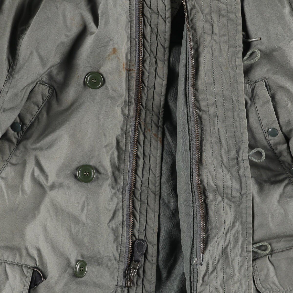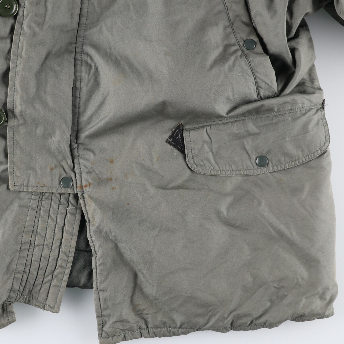 -Stain on the inside of the front and inside the left and right chest pockets. Rubbing on the left abdomen and left hem.