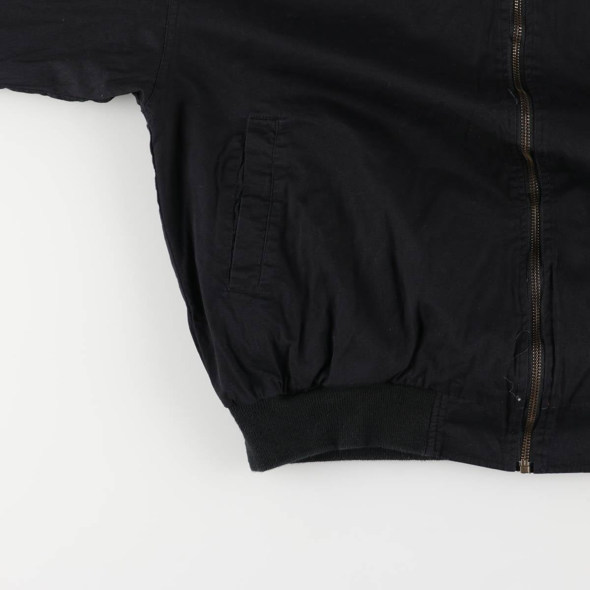 - Stain on the back, entire hem and left and right sleeve ends. Thread pulls on left arm.