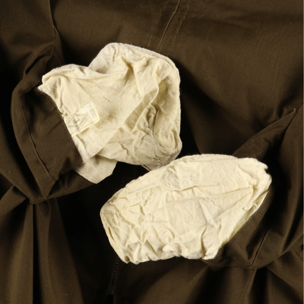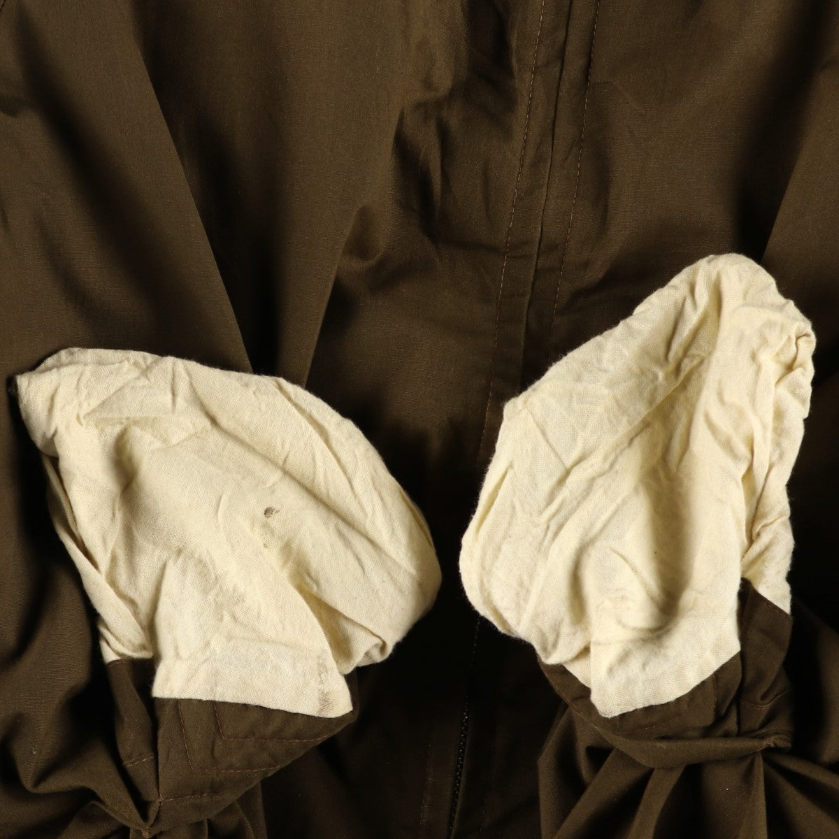 -Stain on front, both sides of abdomen, inside both pockets and right sleeve