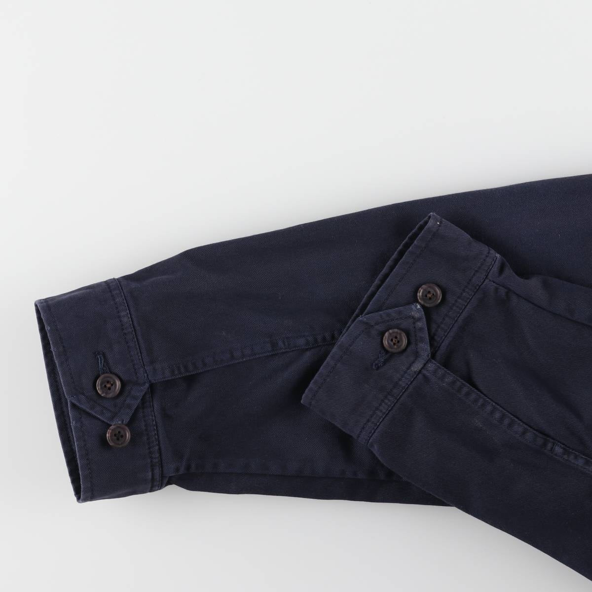-Ribbed slack at back hem. Frayed cuffs on both sleeves. Button on left sleeve replaced.