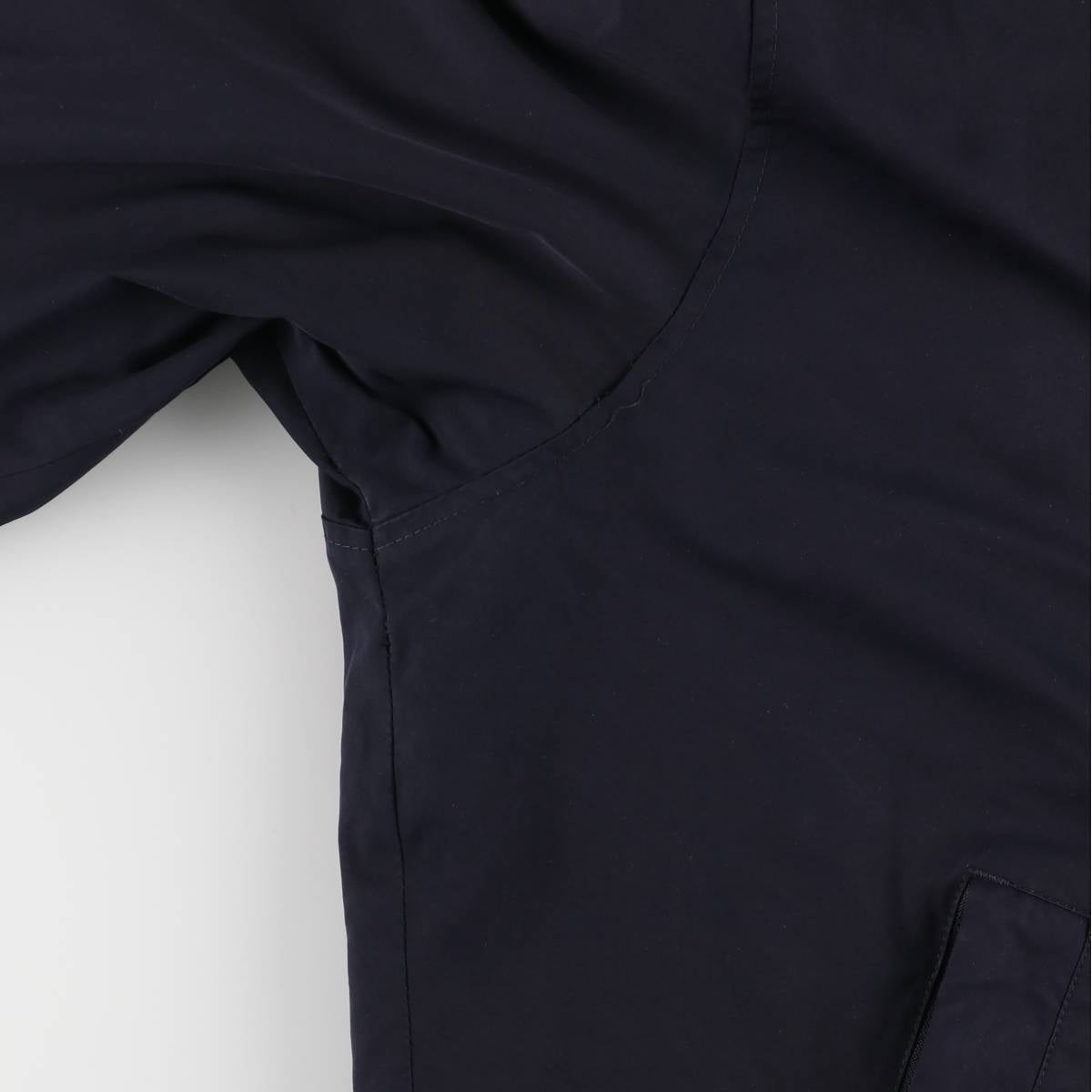 - Front, near the seam at the base of the right arm, thread missing at the end of the right sleeve, repair marks under the right armpit