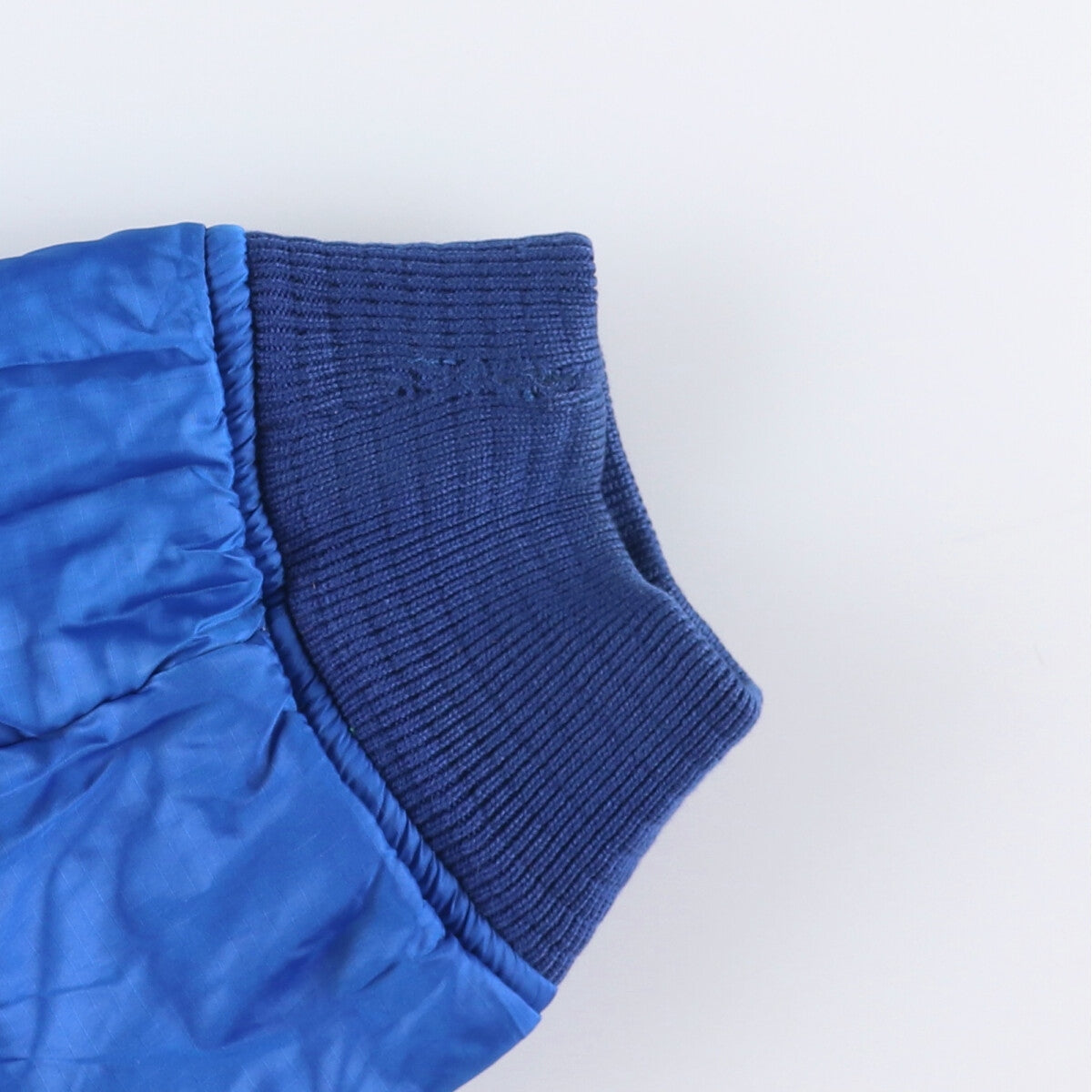 -Stain on both sleeves and right arm at the back, ribbed slack around the collar, and thread pulls on both waists