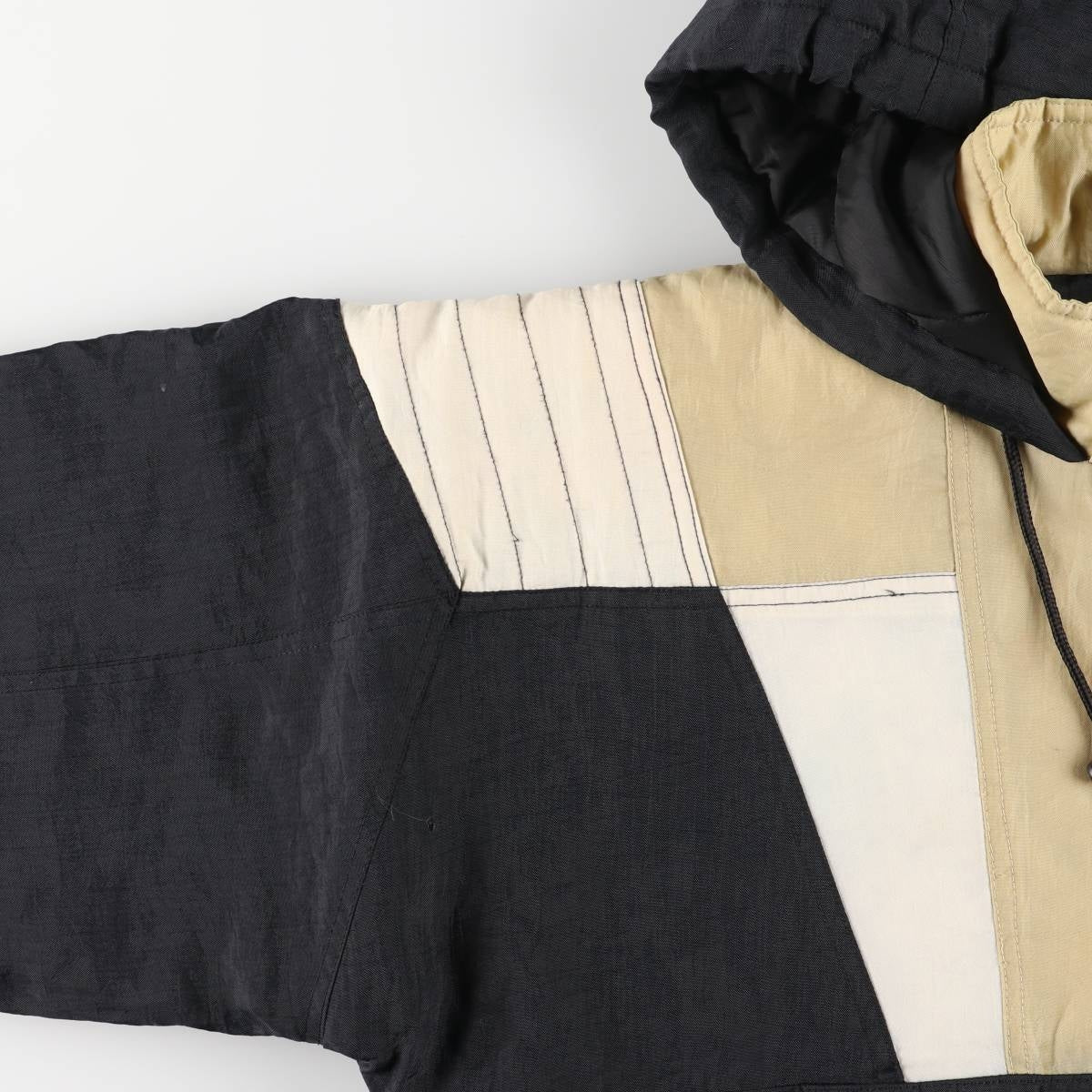 - Hole at the base of the right arm, loose thread at the base of the left arm, damage to the ends of the hood strings on both sides