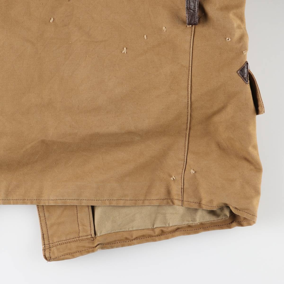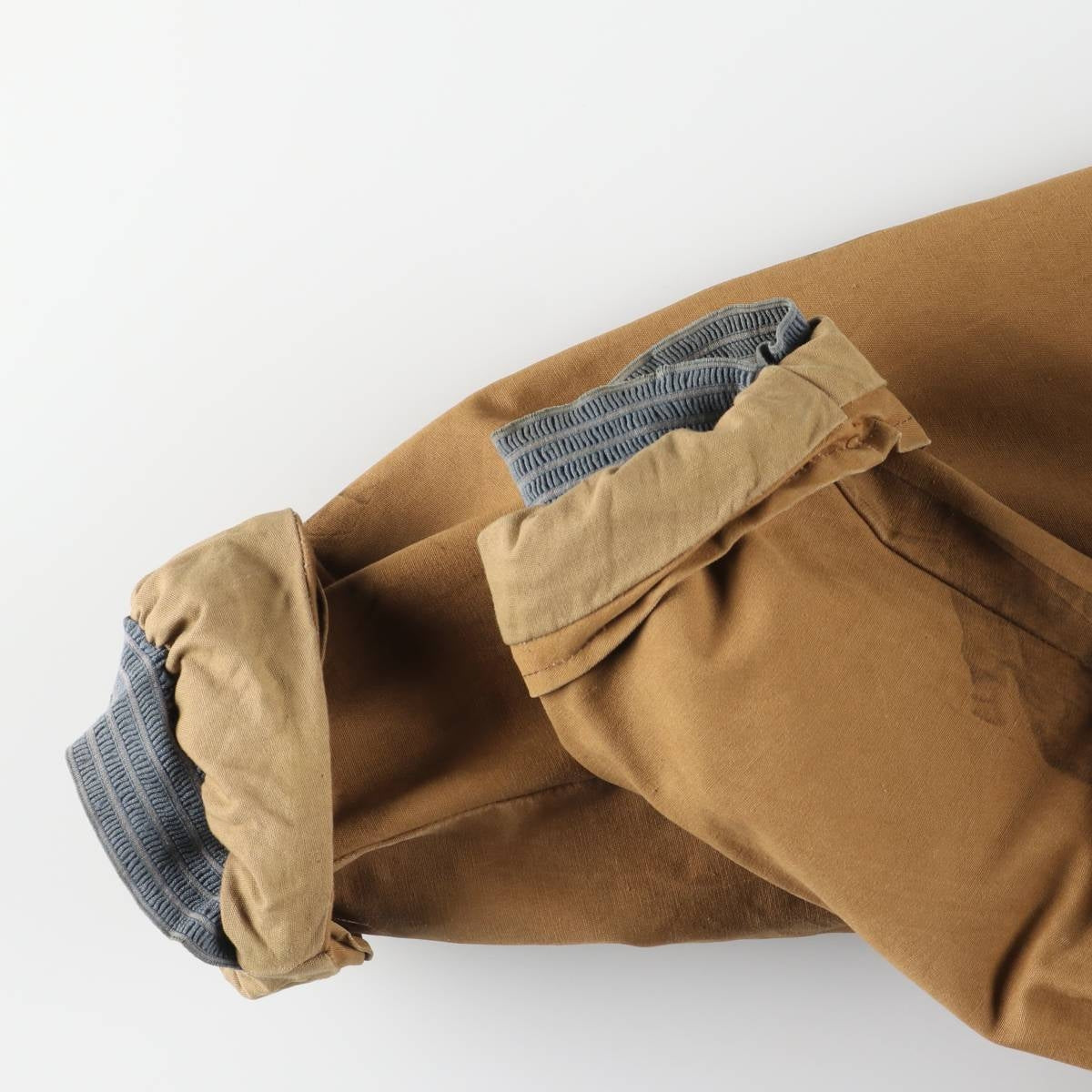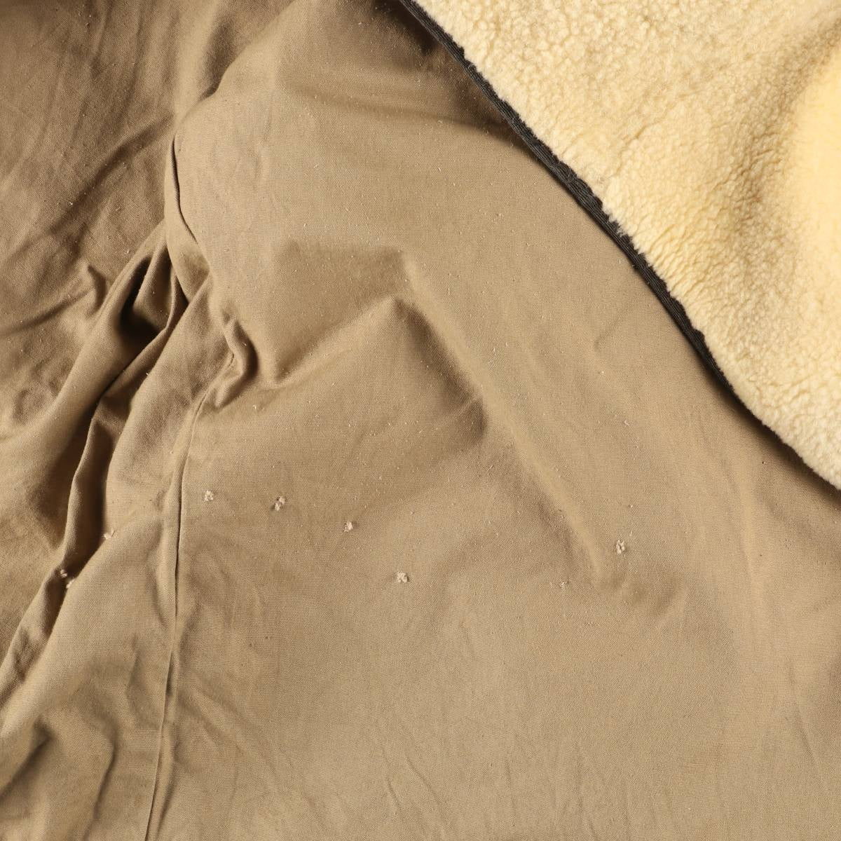 -Inside, pilling throughout, stain on both cuffs, lower abdomen and front right hem, repair marks on left armhole, rubbing on right hip and back right hem, deterioration of rubber on both cuffs