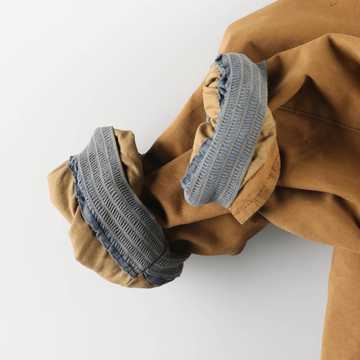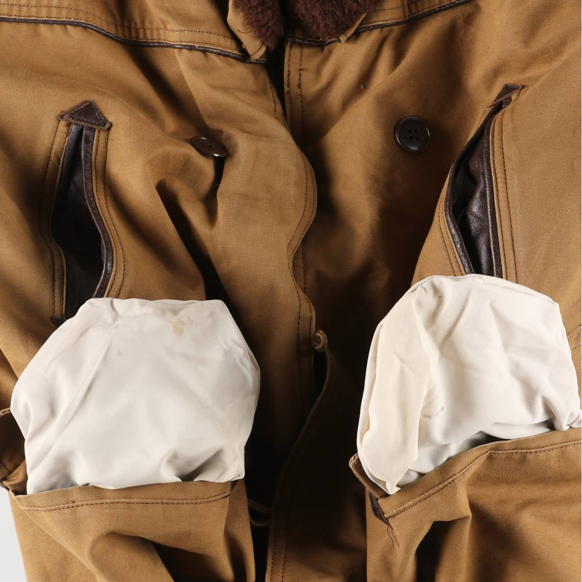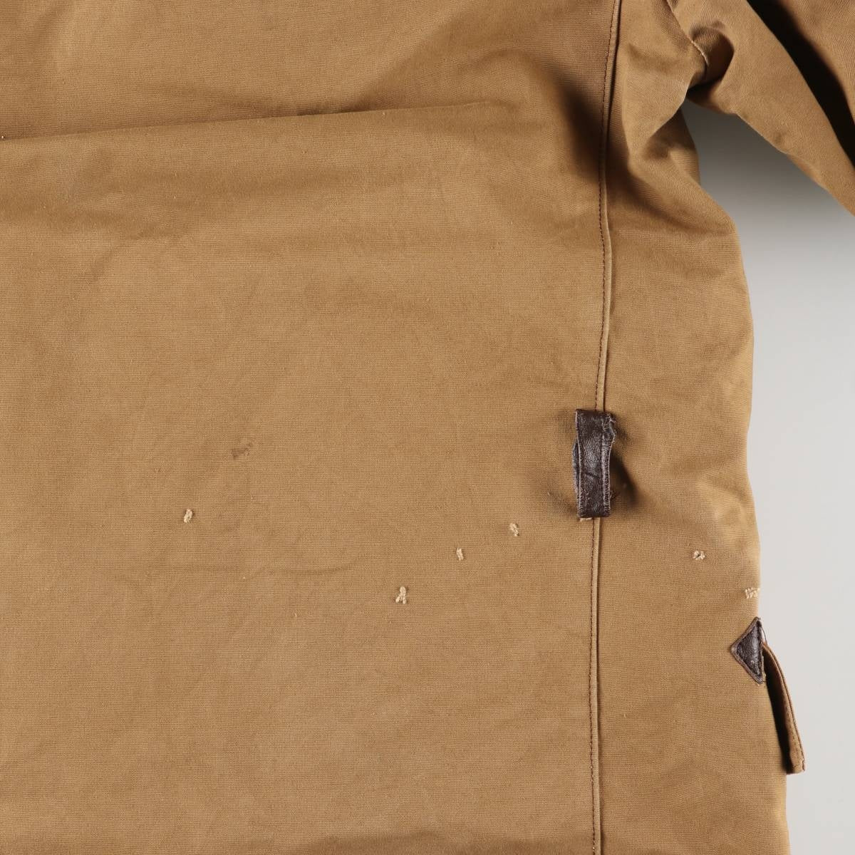 -Inside, pilling throughout, stain on both cuffs, lower abdomen and front right hem, repair marks on left armhole, rubbing on right hip and back right hem, deterioration of rubber on both cuffs